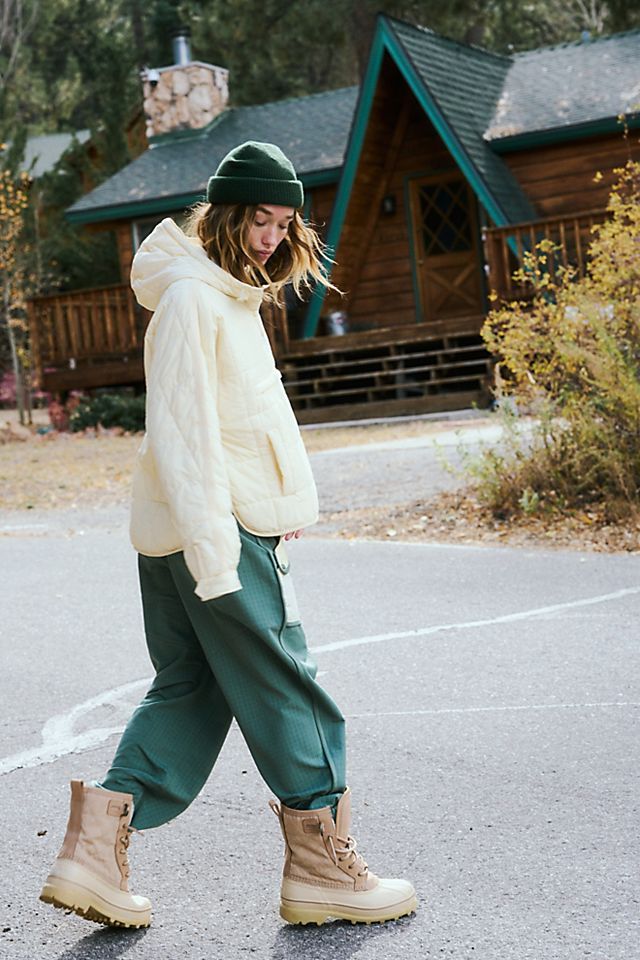 This outfit is the visual definition of cabin-core. A fluffy ivory puffer jacket softens the silhouette while adding bulk in all the right places, paired unexpectedly — but brilliantly — with forest green wide-leg pants. The contrast creates a silhouette that’s both playful and practical. The tan hiking boots ground the outfit, literally and stylistically. This ensemble is ideal for women cold weather treks, especially when trail conditions call for warmth without sacrificing mobility. Best for straight or athletic builds — it might overwhelm petite frames with its voluminous structure.