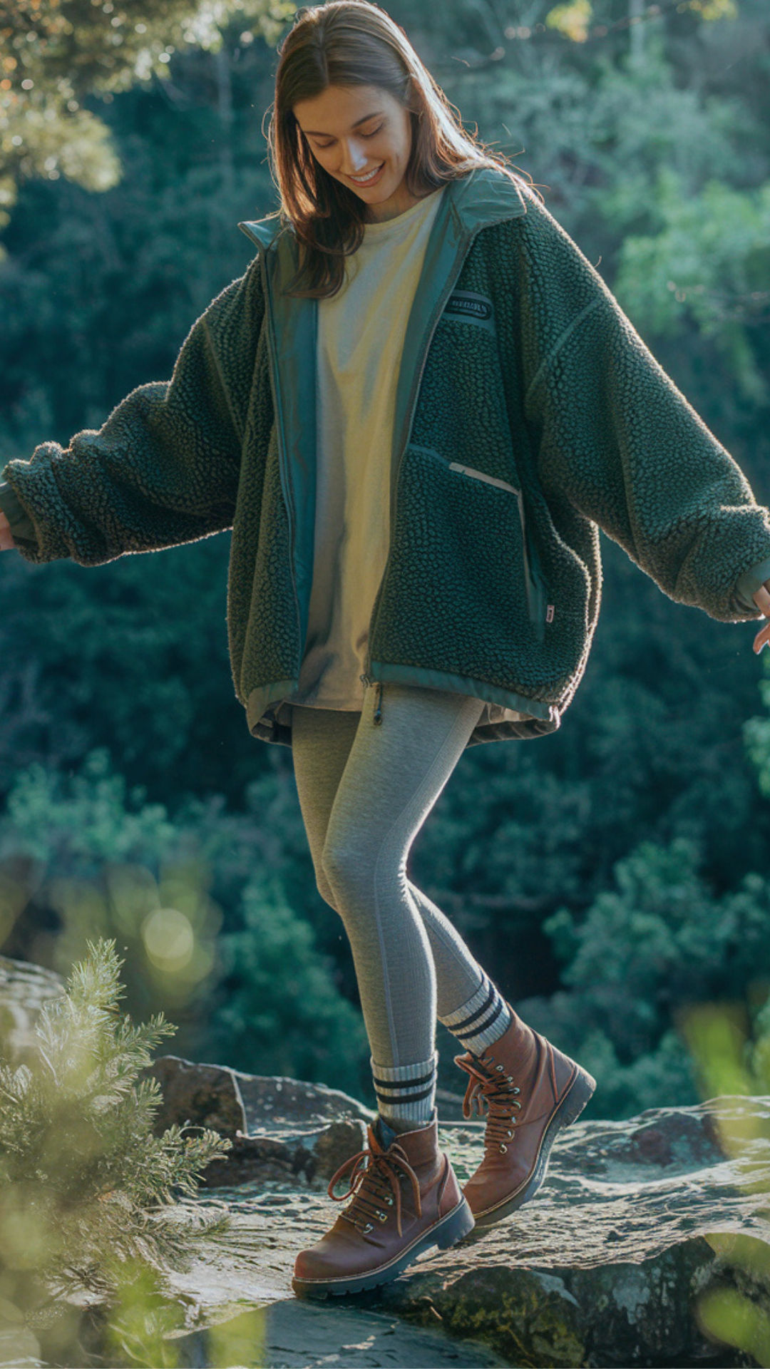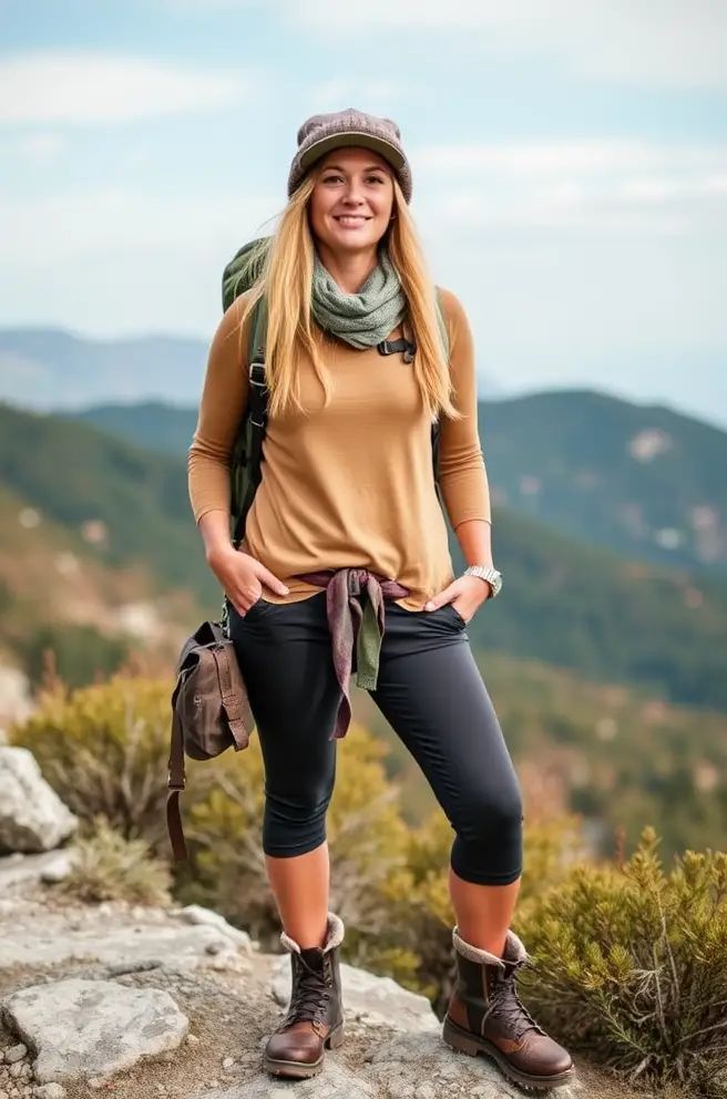 This is a dreamy blend of softness and strength — women casual hikers will love this balance. The oversized green sherpa jacket feels plush and cocoon-like, paired with lightweight grey leggings and sturdy caramel boots. The striped socks peek just high enough to add charm without looking overdone. It’s a cute option for early morning forest strolls or low-elevation mountain trails. Best suited for lean or hourglass shapes, since the bulk of the jacket may add too much volume for those with broader frames.