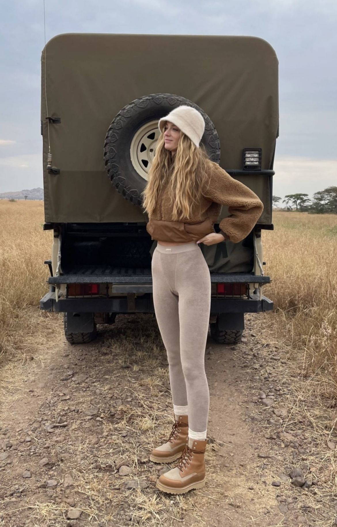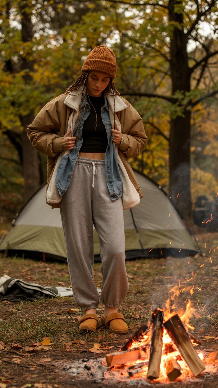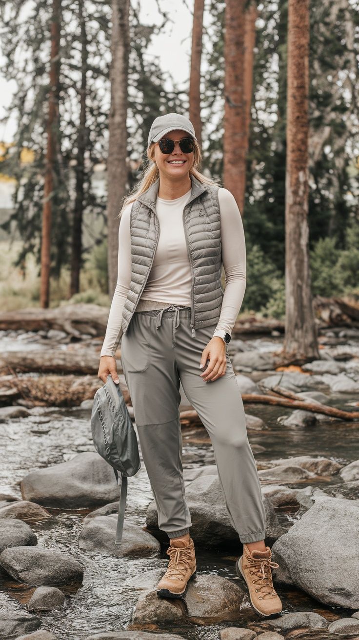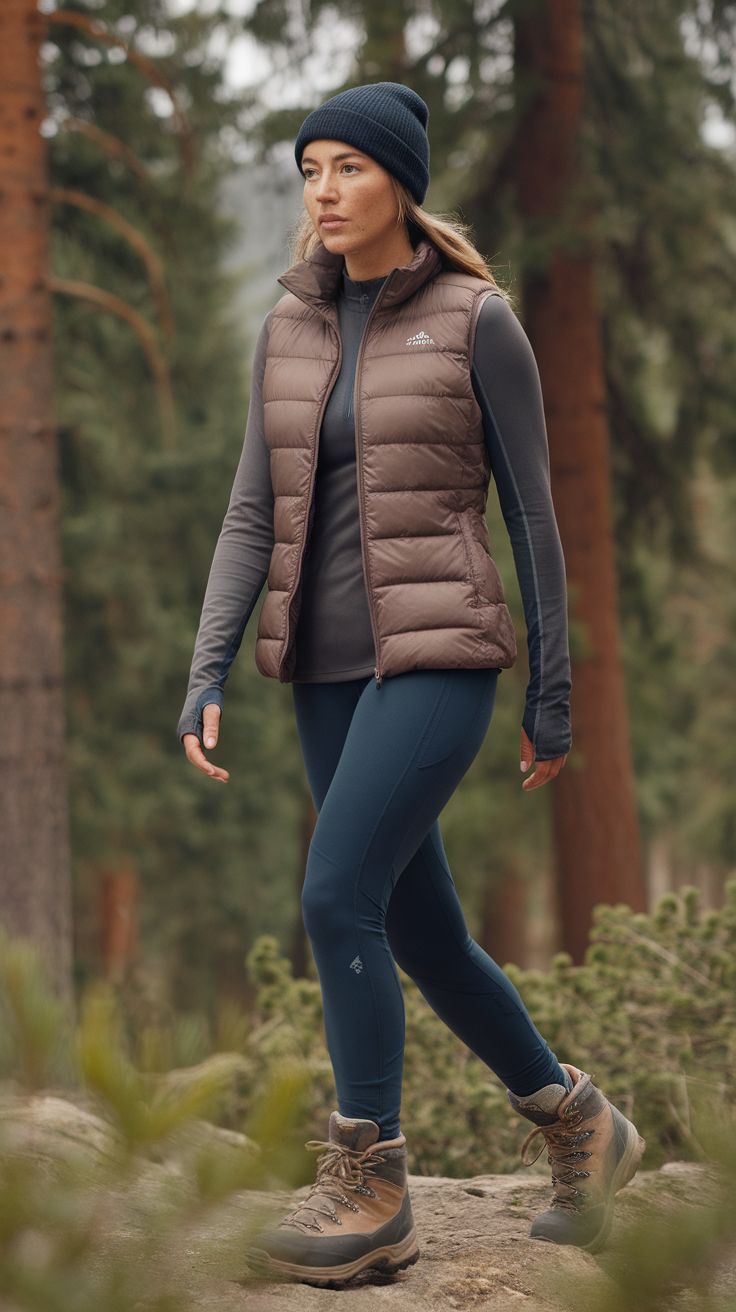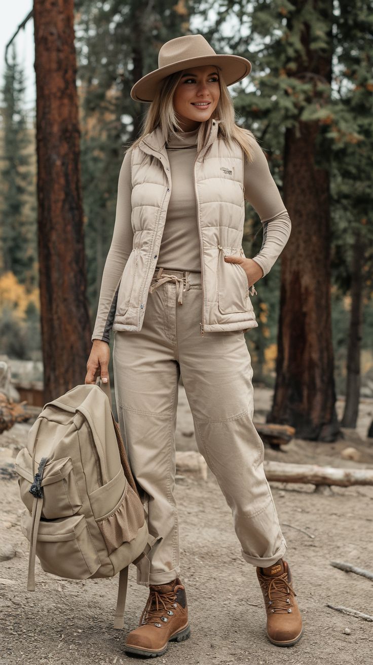 There’s something quietly luxurious about monochrome in the woods. This tone-on-tone beige ensemble leans into modest, elegant utility — think Switzerland mountain lodge vibes with safari coolness. The puffer vest adds structure and warmth without looking bulky, while the high-waisted joggers and matching top lengthen the silhouette. Great for rectangular and pear-shaped bodies, this look flatters with vertical lines and soft hues.