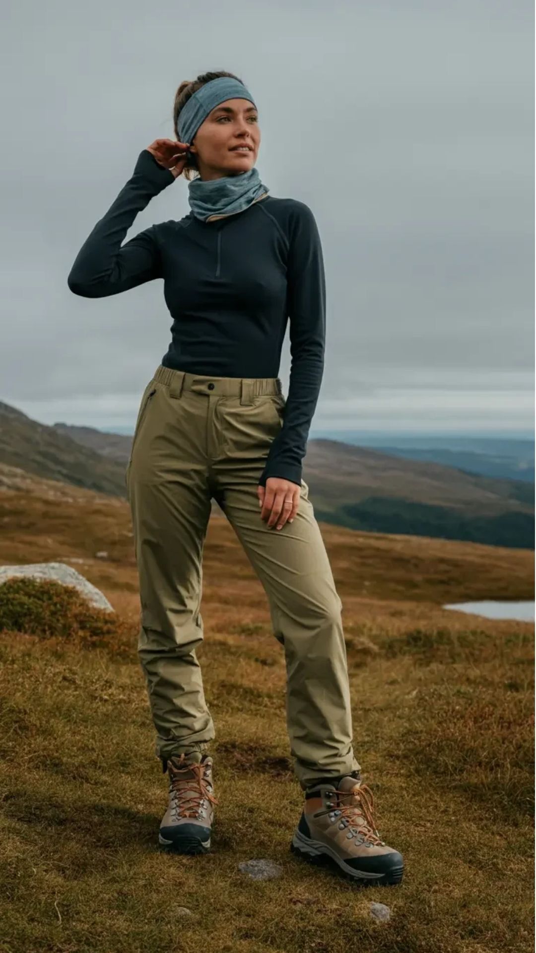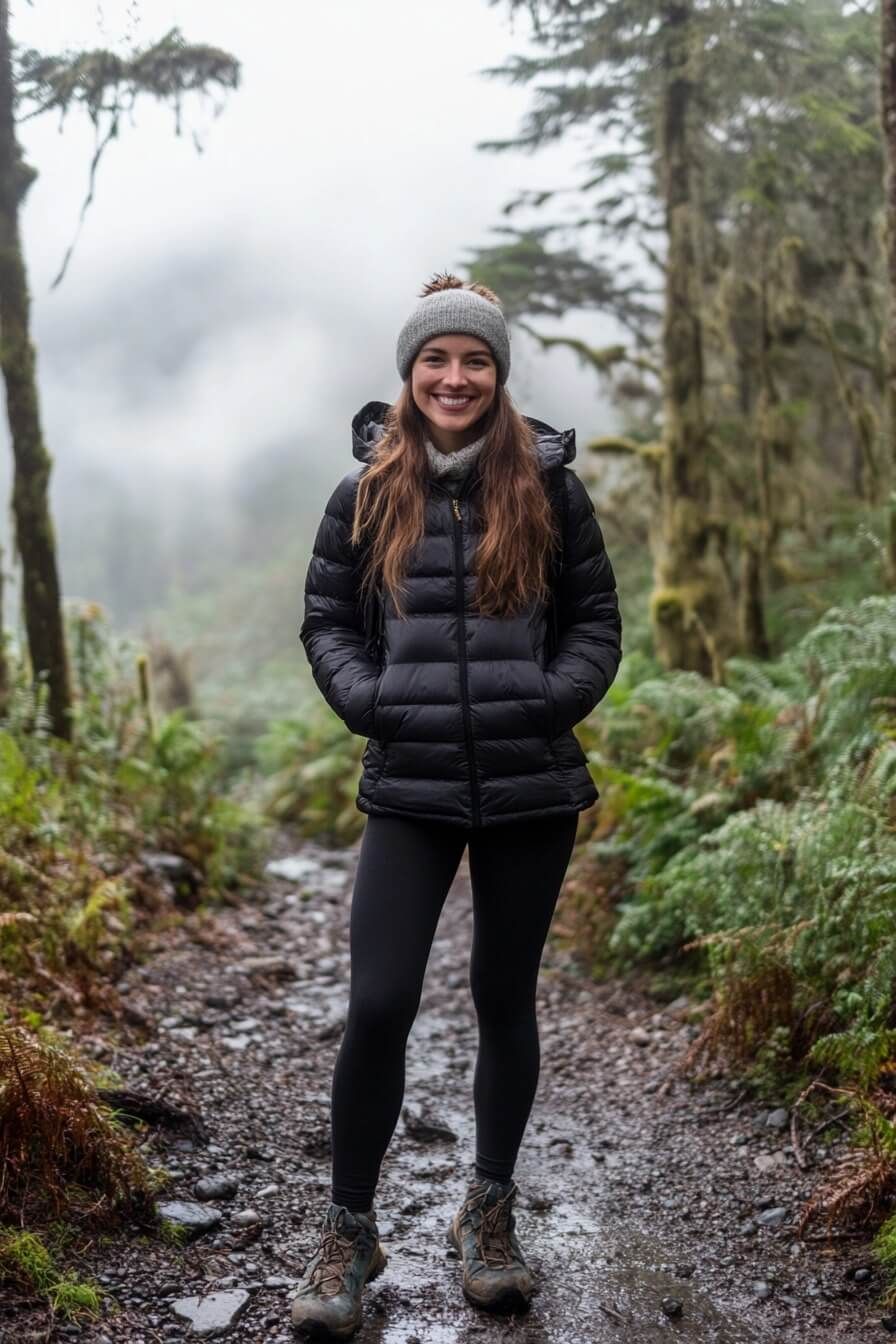 This is what you wear when you’re deep in rainy season territory and the clouds don’t care about your plans. The olive rain shell is sleek, tailored, and breathable — keeping moisture out and your outfit intact. It’s paired smartly with wine-colored leggings, creating a balanced and earthy palette that suits women cold weather hikers. Great for all body shapes, this combo offers protection without the bulk.