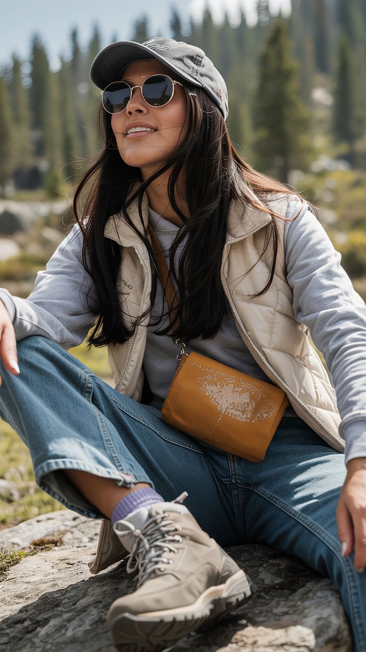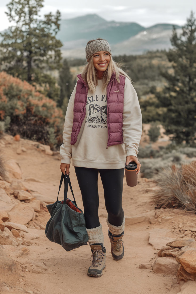 This look gives playful prepper with a nod to granola style — ideal for early morning treks when the chill still clings to the air. The puffy berry-toned vest adds a punch of color against the neutral oversized graphic sweatshirt. Paired with leggings and thick socks peeking out of hiking boots, it’s the ultimate women casual uniform for a rainy-day walk or quick trail coffee run. Universally flattering and especially great for curvier figures thanks to the contrast layering.