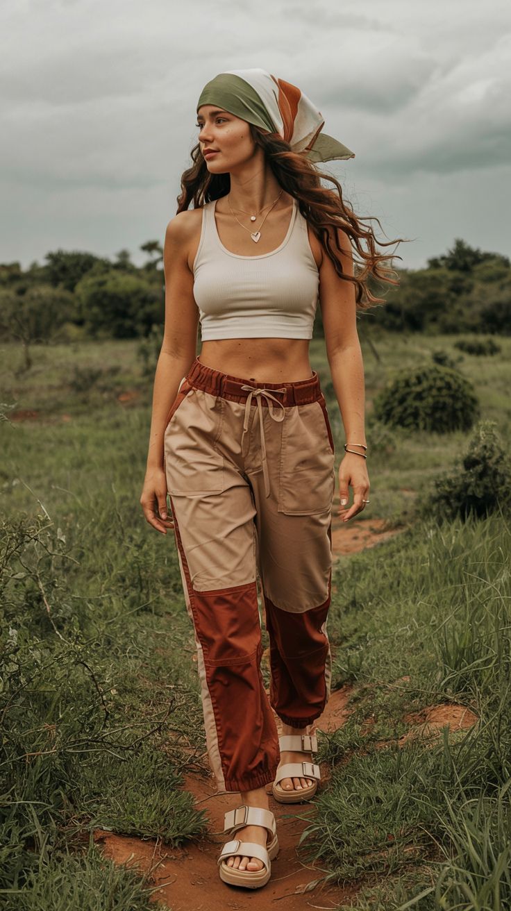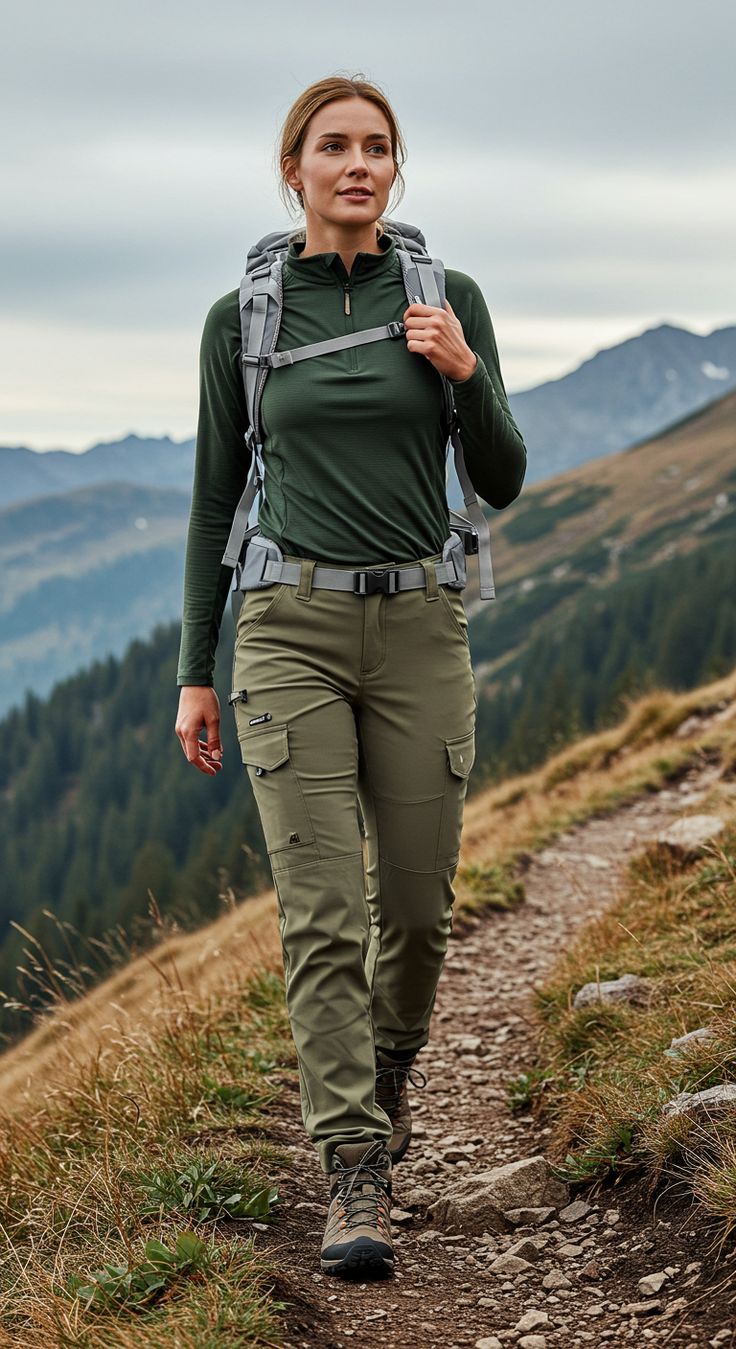 If you’re the kind of hiker who grabs a matcha latte on the way to the trailhead, this urban-inspired outfit blends streetwear with trail practicality. The tapered cargo pants and chunky sneakers offer flexibility and grip, while the black tee and crossbody bag keep it sleek and simple. Ideal for taller or athletic body types, the silhouette balances volume and fit with confident ease. Though not suited for rugged terrain, it’s perfect for casual walks, city trails, or light outdoor errands.