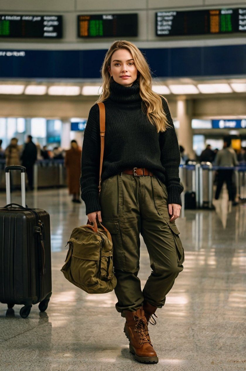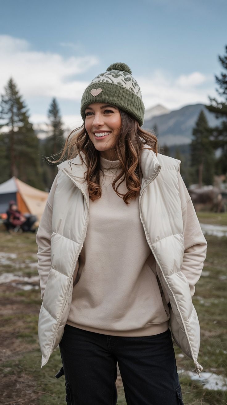 Here’s an outfit that toes the line between rugged and soft. A modest, cozy puffer vest over a cream sweatshirt is a women casual uniform in the great outdoors. Black cargo pants add depth and contrast, perfect for woodsy mornings in Montana or cozy days around camp.