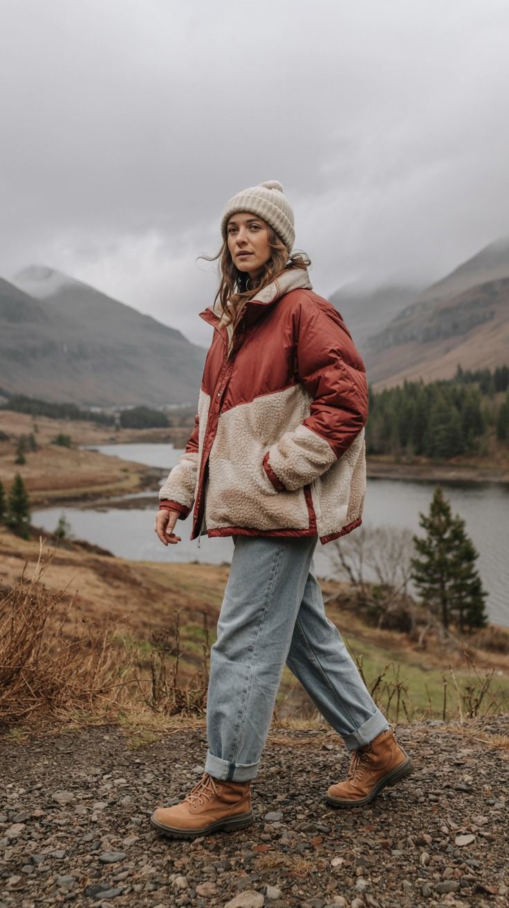 This is peak fall women cold weather style. The rust and cream sherpa coat stands out against overcast skies and golden hills. Paired with cuffed light jeans and classic tan hiking boots, it leans heavily vintage while staying totally wearable. Ideal for photo-friendly trails or scenic ridge walks.
