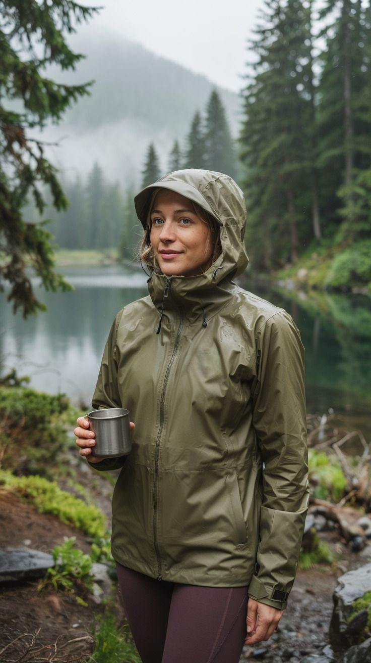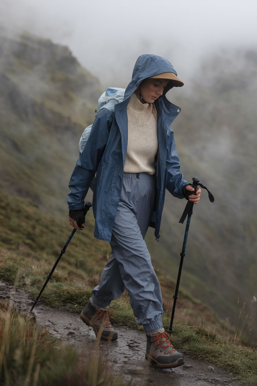 This is a rainy day hiking masterclass. The layered knit, water-resistant shell, and practical pants are all styled in fog-drenched harmony. Great for any body type, this combo delivers movement, warmth, and aesthetic appeal — especially when visibility is low and weather is unpredictable.