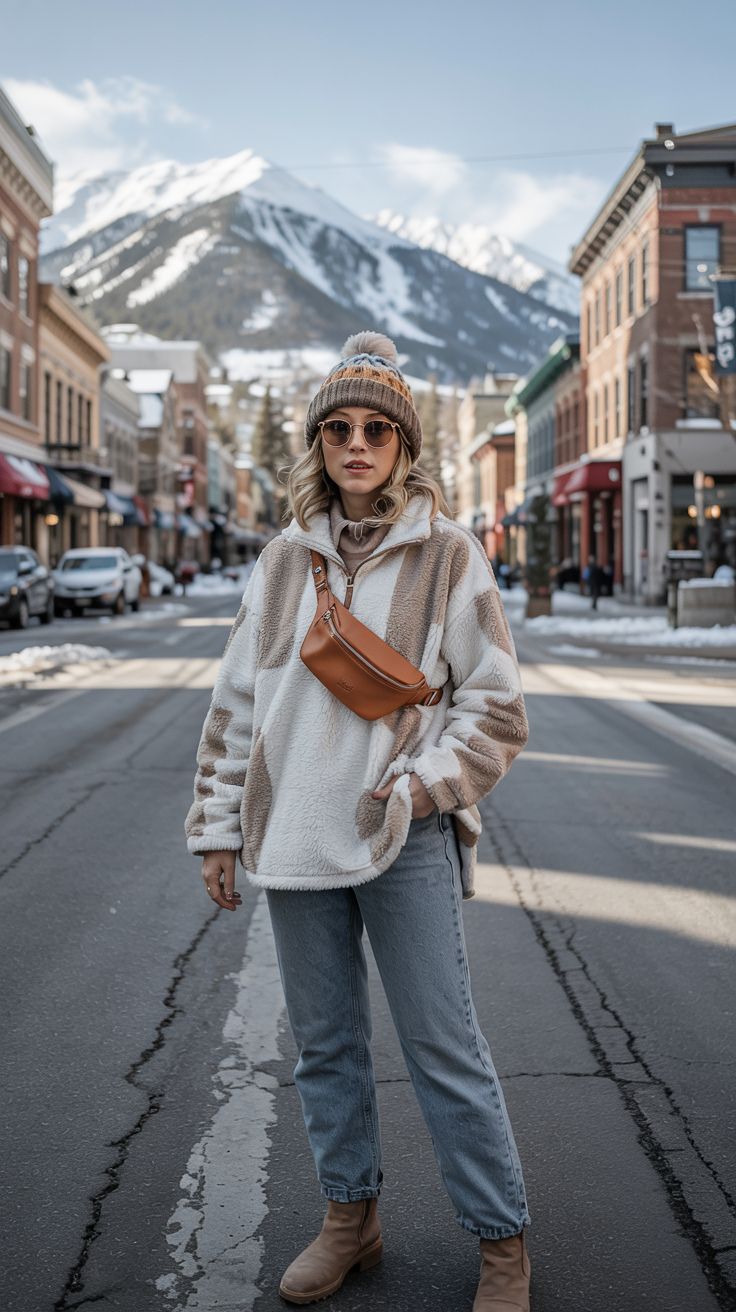 Now this is winter mountain town realness. The oversized sherpa pullover and relaxed denim are giving major vintage ski lodge energy. With layered neutrals and warm textures, the outfit is practical for low-key snowy strolls or sipping cocoa post-hike. Best suited for hourglass or rectangle figures, this look thrives when worn slightly oversized and effortlessly cozy.