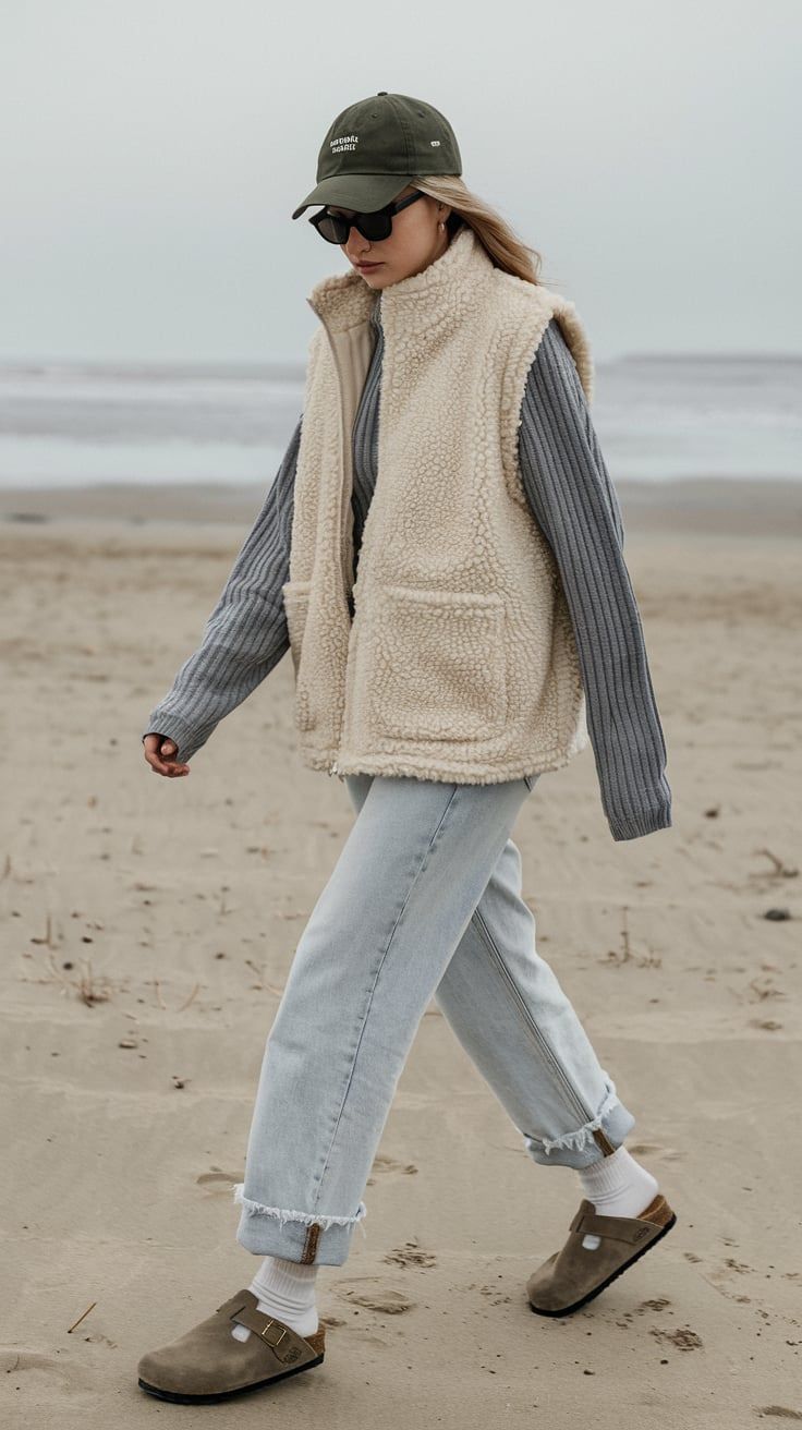 What happens when the granola aesthetic hits the coast? You get this effortlessly layered, modest look that works perfectly for water-adjacent walks. The fuzzy vest and ribbed sweater offer warmth without overheating, while the Birkenstock-style clogs lean casual but grounded. The relaxed silhouette suits tall or slender frames but could overwhelm petite builds unless sleeves and hems are cropped.