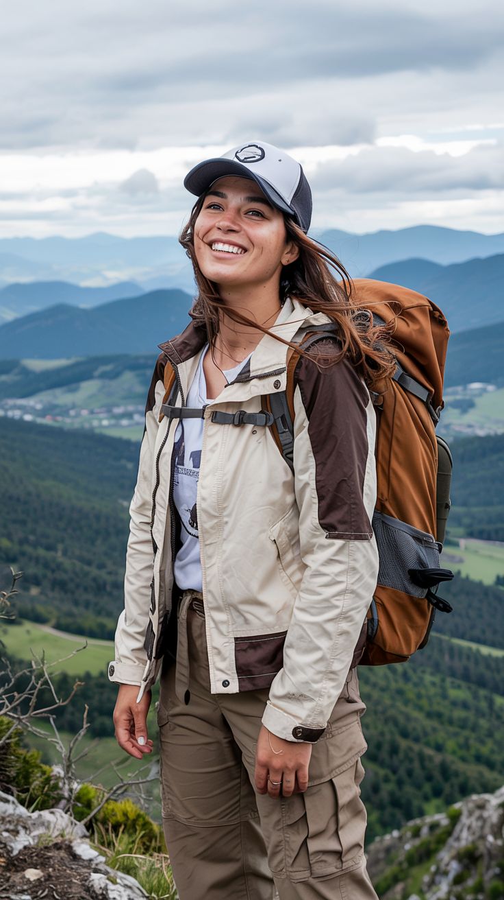 This is the poster look for a women mountain climber. Functional, confident, and distinctly cold weather ready. The panel jacket in earthy neutrals screams technical but make it stylish. Cargo pants are ideal for longer hikes — flexible yet structured. The baseball cap and rust-toned backpack complete a no-fuss uniform built for adventure. This is perfect for hourglass or tall builds — the streamlined gear enhances the silhouette while staying performance-focused.
