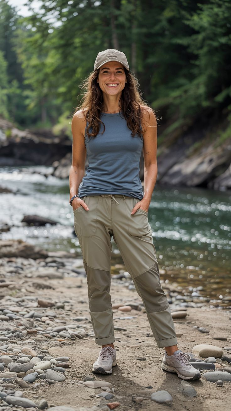 For those hot weather fall days, this minimal outfit hits the mark. Olive joggers with a modern twist and a fitted tank top walk the line between utility and simplicity. Ideal for petite and athletic frames, this combo keeps you cool and comfortable without sacrificing style. The look also leans into that aesthetic outdoorsy vibe that works both for trail hikes and casual strolls near water.