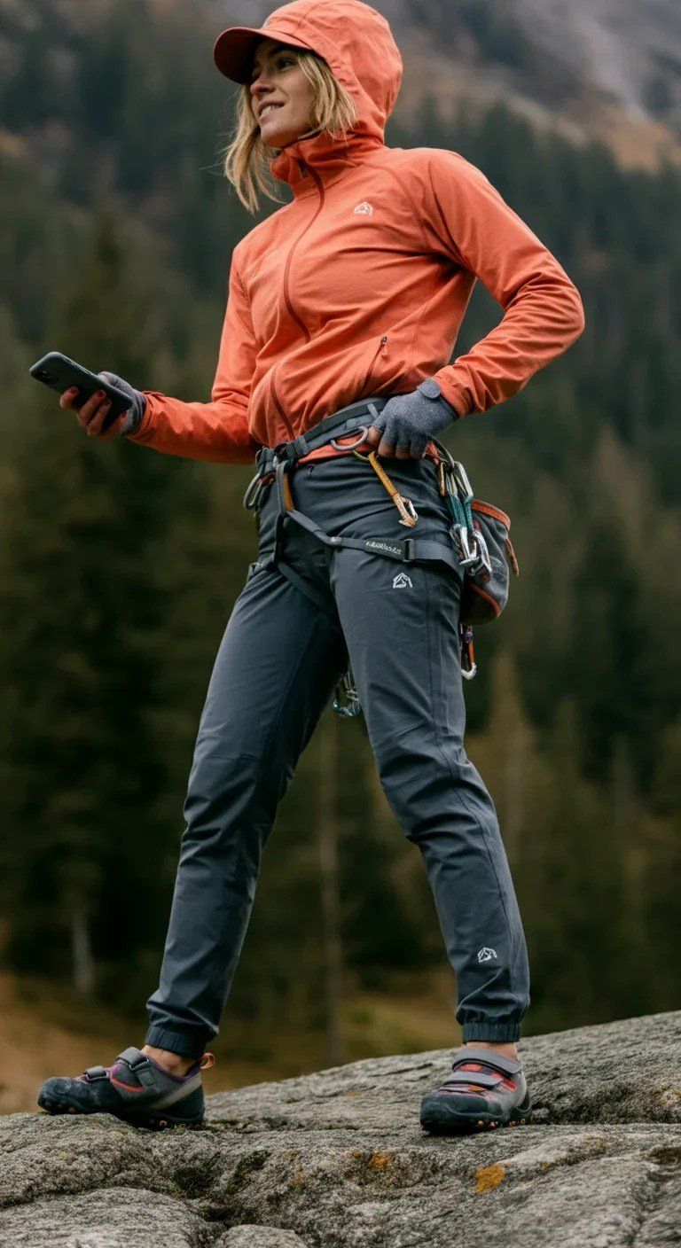 Serving up technical edge with a splash of color, this look is built for mountain missions. The burnt orange windbreaker, equipped with a hood and climbing harness, shouts “prepared.” Matched with fitted charcoal climbing pants and grip shoes, it’s serious gear that still feels editorial. Great for long torsos or lean athletic frames.