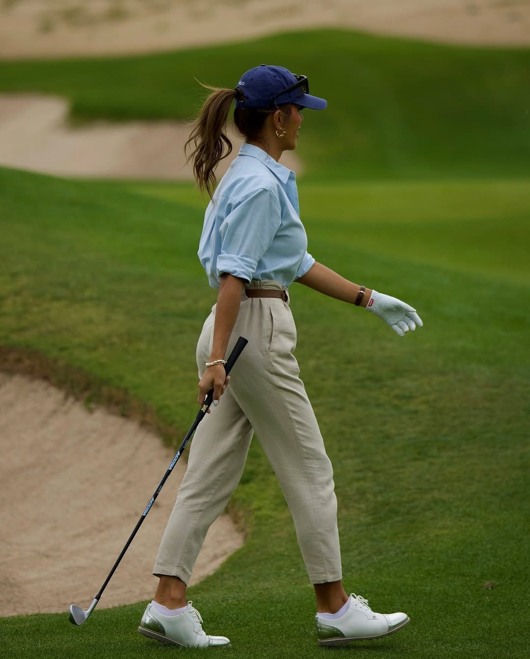 This look captures the heart of golf chic: breezy, minimal, and naturally polished. The light blue knit Top tucked casually into tailored white Women shorts creates a clean silhouette that feels both sporty and feminine—exactly the kind of outfit that works for warm Women summer days without sacrificing sophistication. It’s also incredibly practical; the lightweight fabric breathes well during long games, while the structured shorts allow full movement. This outfit is especially flattering on athletic, straight, or hourglass figures thanks to the defined waist and smooth lines. It’s less ideal for extremely cold-weather settings, of course, but perfect for sunlit rounds and post-game brunch.