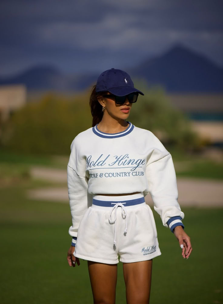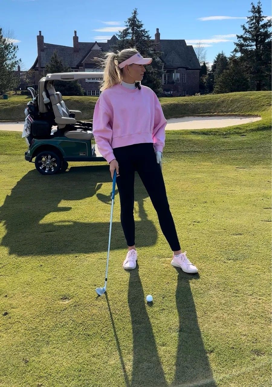 This is the definition of casual golf comfort—soft, light, and perfect for breezy afternoons. The oversized cream sweatshirt with bold GOLF lettering gives off a relaxed collegiate energy, while the gray pleated skirt keeps things feminine and structured. Ideal for transitional weather and suited to most body types, this outfit works well for warm fall days, cooler Women summer afternoons, or post-game lounging.