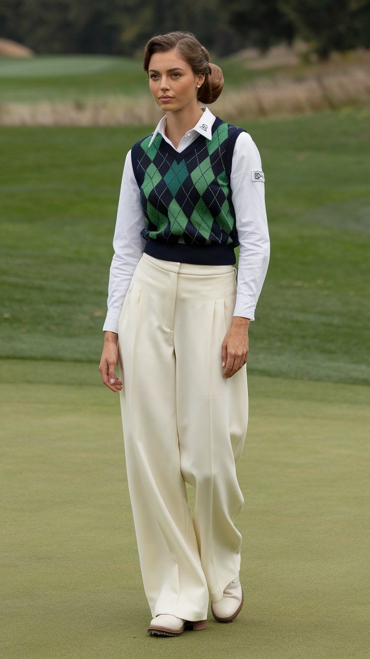 A monochrome cream set on the course always gives an “I know exactly what I’m doing” kind of confidence. This outfit blends minimalism and performance beautifully, especially with the structured Women pants that elongate the legs and bring a modern twist to traditional golf attire. Because of the neutral palette, this look works for nearly any body type—it lengthens, softens, and balances without effort. It’s ideal for cooler summer mornings, early fall, and casual games, though it wouldn’t hold up in Women winter cold weather.