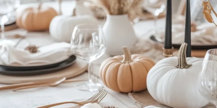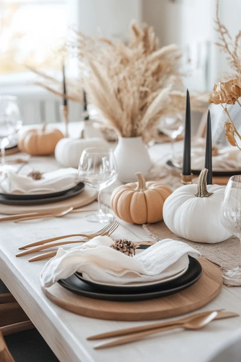 With sleek black candles and minimalist dinnerware, the setup feels modern yet grounded. The atmosphere is cozy and inviting, perfect for an intimate gathering that celebrates the beauty of the season.