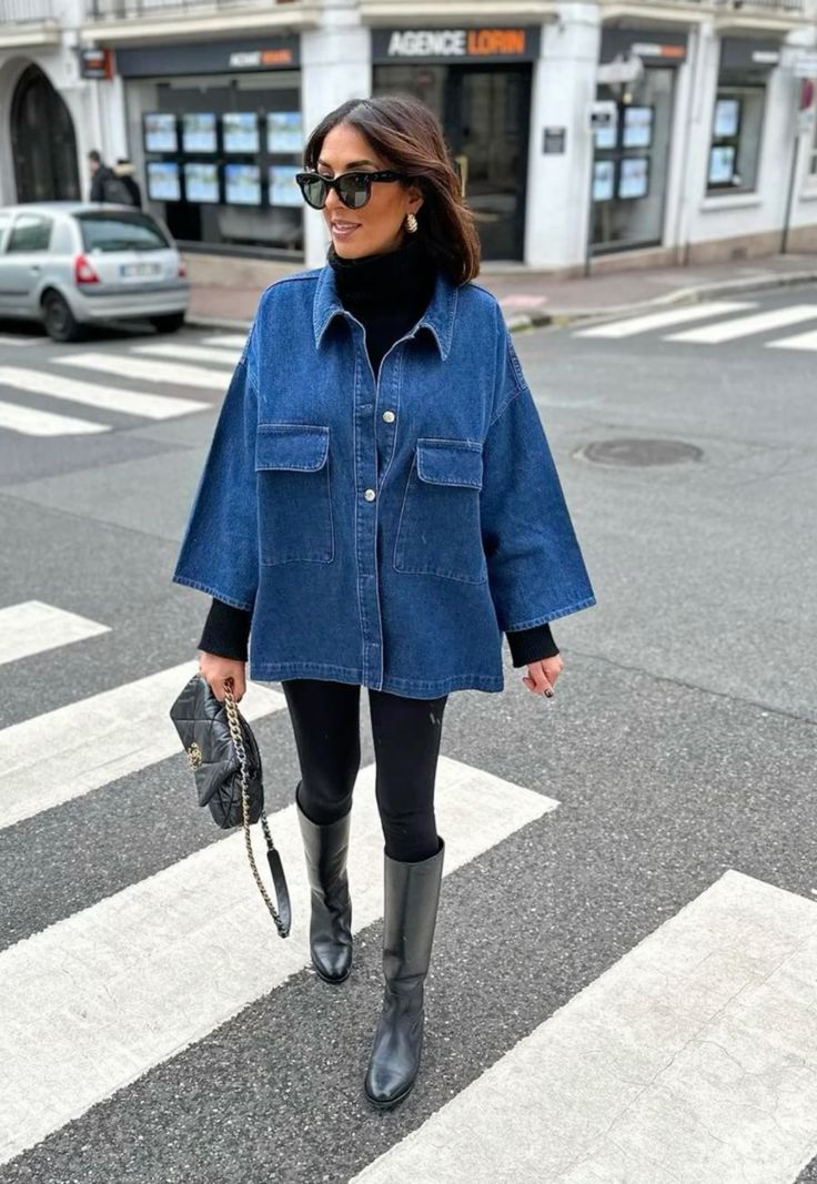 Is there anything more “quiet luxury” than an oversized denim jacket styled like outerwear? This look features a deep blue button-down denim shirt-jacket with wide sleeves and utility pockets. Paired with a black turtleneck, leggings, and knee-high boots, the result is a bold mix of city chic and casual elegance. This works beautifully for petite women, as the length hits just low enough to elongate without swallowing the body. Great for shopping days, city commutes, or even casual office days.