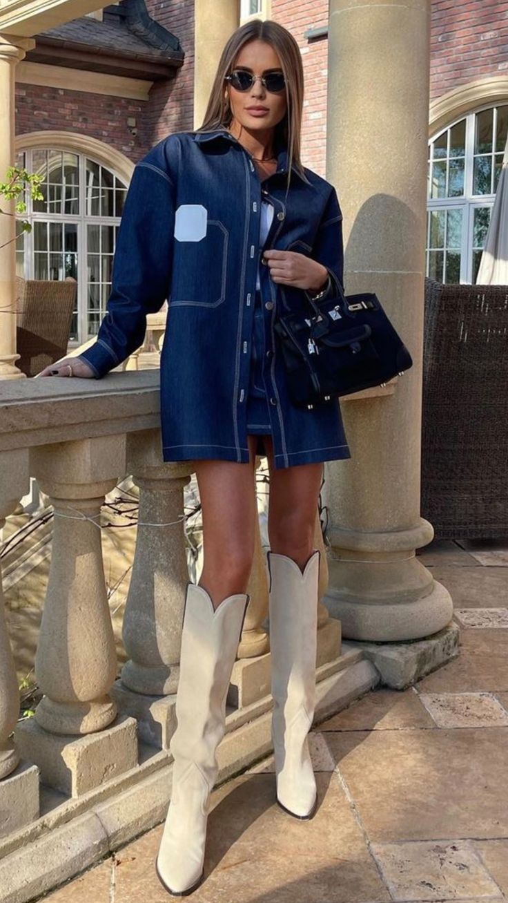 Denim goes glamorous in this bold combo of tailored dark jacket and mini dress, anchored by tall white cowboy boots. The structured lines and contrasting pocket details make it one of the most editorial-friendly looks on the list. Best suited for long-legged women or those looking to play with proportion. Ideal for daytime events, garden parties, or Instagram-heavy brunches.