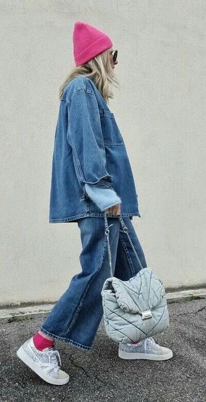 Sometimes all it takes is a pink beanie. This otherwise simple denim-on-denim look pops thanks to that bold accessory. Wide-leg pants and an oversized jacket offer a nostalgic silhouette that’s giving 90s, while silver sneakers and a quilted cloud bag pull us right back into 2025. Great for petite frames or anyone with a playful edge.