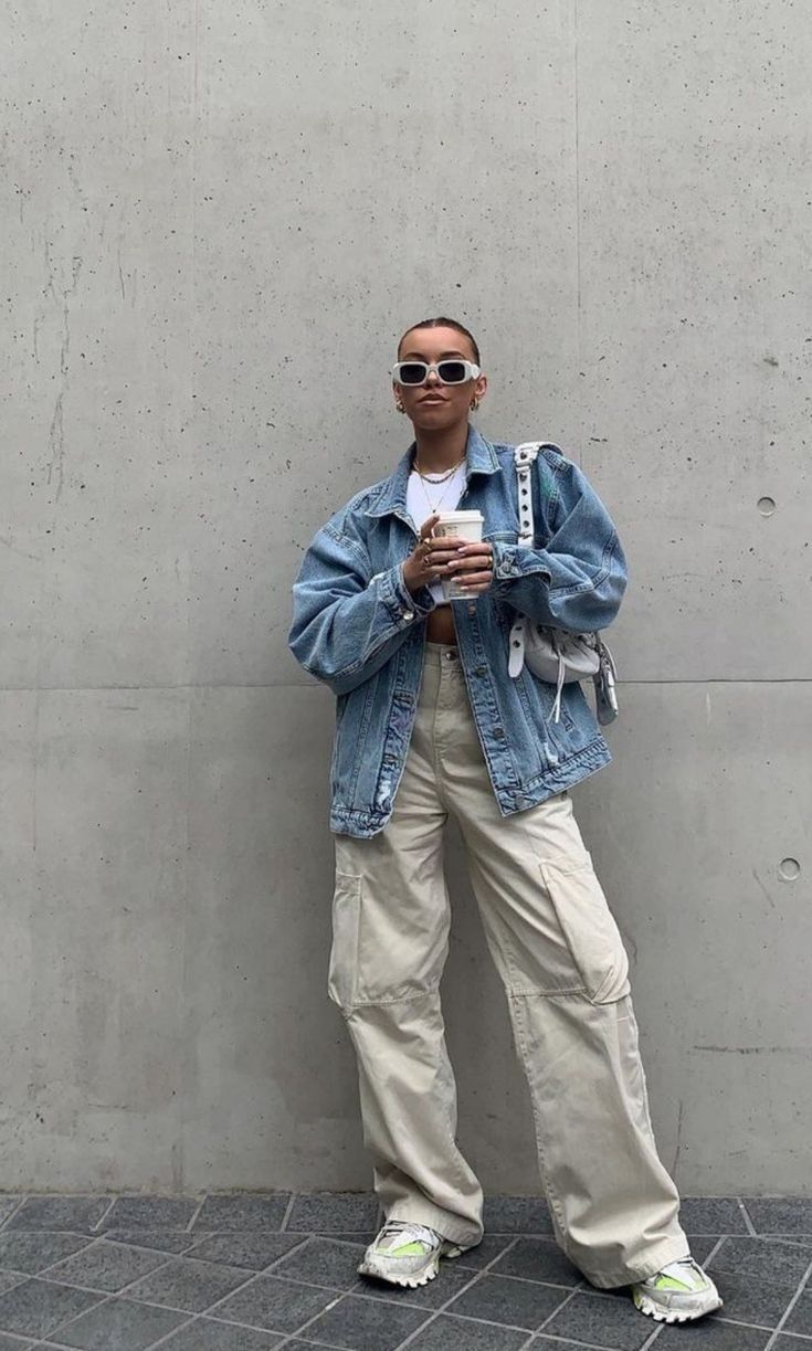 Relaxed, intentional, and a little rebellious — this look is the definition of 2025 off-duty energy. A boxy oversized light-wash jacket is layered over a tiny crop top and paired with exaggerated cargo pants in a chalky cream. The combination flatters curvier body types by cinching at the waist and letting the pants balance the volume. Think: fashion-forward errands, coffee dates, or casual rooftop parties.