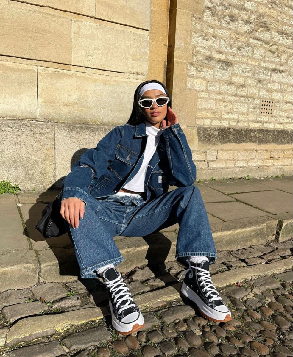 This denim set plays on proportion and nostalgia. A dark blue cropped jacket meets flared jeans, all anchored by graphic high-top sneakers. A white mock-neck crop top and wide white headband break the tone for visual lift. Ideal for women with a long torso or athletic build, this outfit adds shape without clinging. Great for daytime strolls, creative campus looks, or just channeling serious main character vibes.