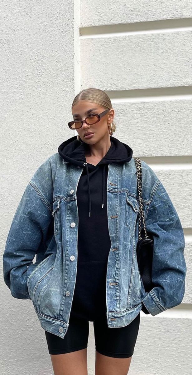 This one’s pure 2025 attitude. A washed blue jacket with exaggerated seams and a hooded black sweatshirt underneath gives a sporty-grunge effect. Paired with biker shorts and gold hoops, this look is sharp yet casual. Works best for rectangular or hourglass figures — it cinches nothing but still frames the body in an intriguing way. Perfect for errands, festivals, or days when you want to feel chill but put-together.