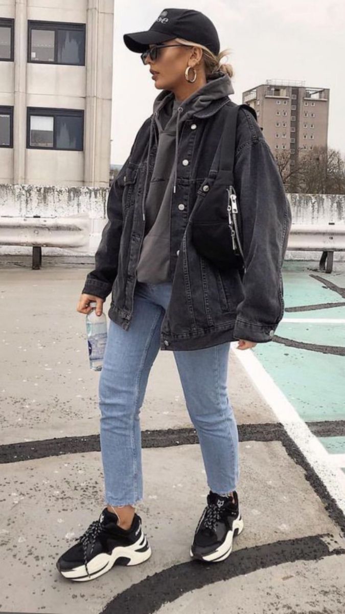 Monochrome-meets-athleisure in this oversized black denim jacket layered over a slate grey hoodie. Cropped jeans and chunky sneakers make this look wearable and fast-paced — ideal for a city commute, coffee run, or rooftop chill. A baseball cap adds edge, while the hoop earrings give it just the right amount of polish. Suits most body types thanks to the balanced top and bottom proportions.