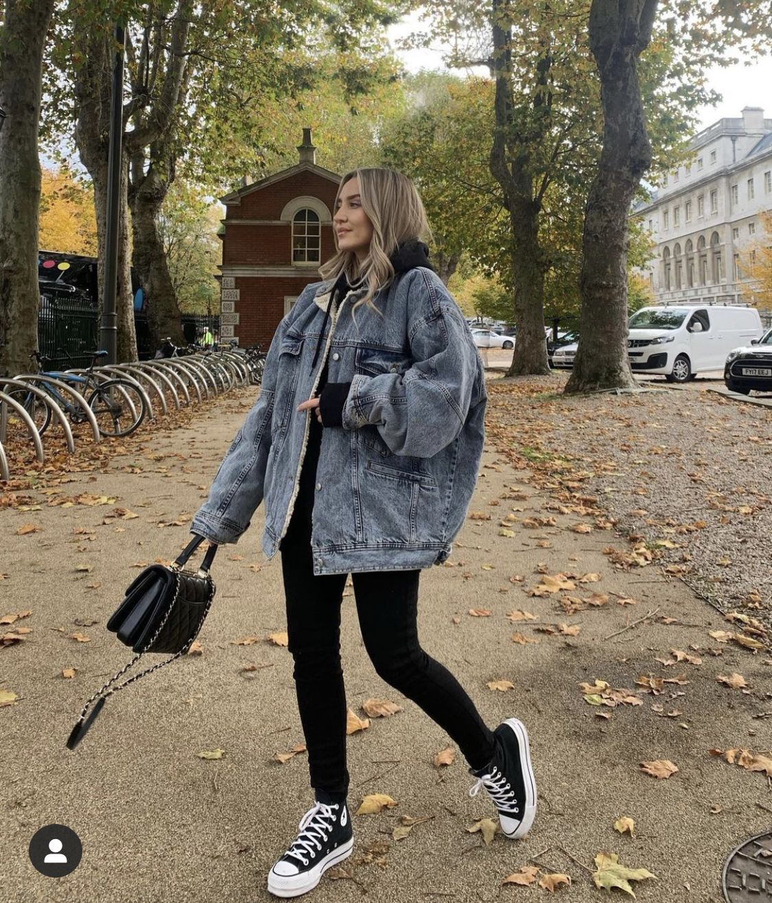 Equal parts 80s nostalgia and Pinterest fall energy, this look layers a grey-washed, oversized denim jacket over all-black pieces and classic Converse. The result? A cozy, crisp-weather dream. Perfect for narrow or athletic frames, the look allows movement while keeping structure up top. Best worn under amber trees, coffee in hand.