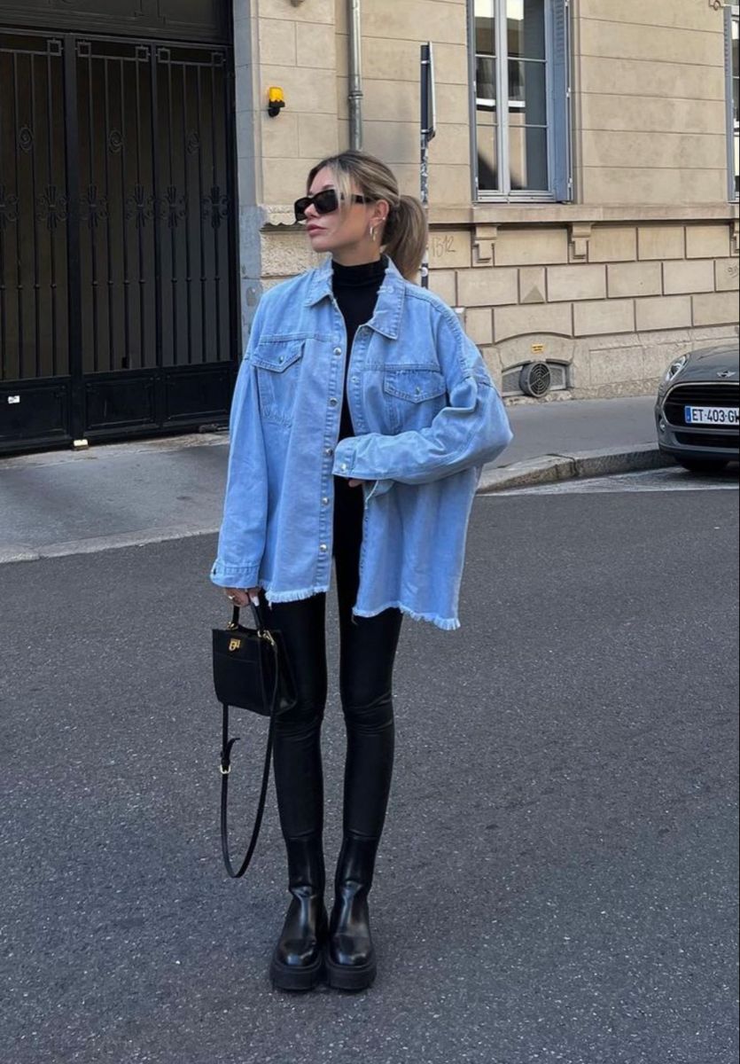 There’s something so commanding about this combo. The light blue, nearly grey, shirt-style jacket acts as a denim duster over a slim black base — a fitted turtleneck and high-waisted leather pants. A minimalist dream that works exceptionally well on taller frames or those with a longer torso. Ideal for transitional weather and perfect for fashion weeks, coffee meetings, or museum-hopping in Paris.
