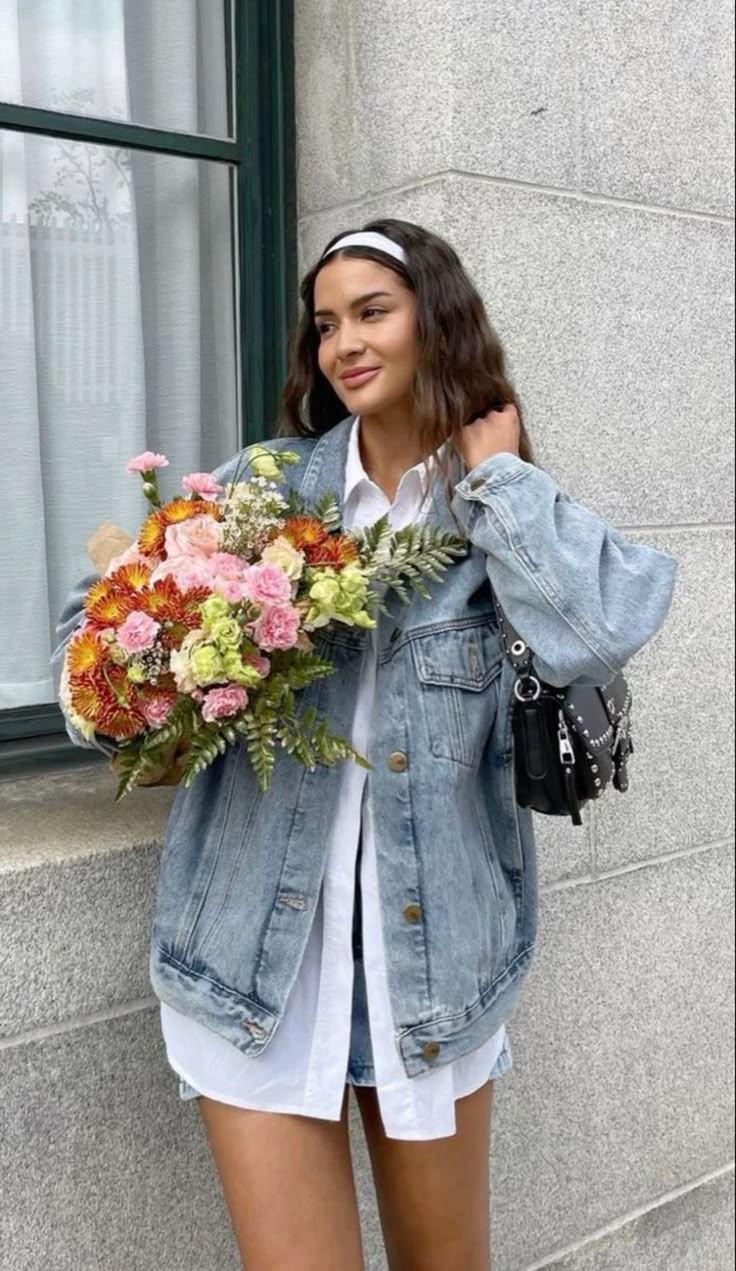 There’s something tender and timeless about this look. A washed light blue denim jacket paired with a classic white shirt-dress underneath, finished with a handful of flowers and a gentle smile. Feminine, vintage, and wearable across many shapes, it’s ideal for women who love romantic aesthetics without sacrificing comfort. Perfect for daytime dates, floral markets, or even a cozy picnic.