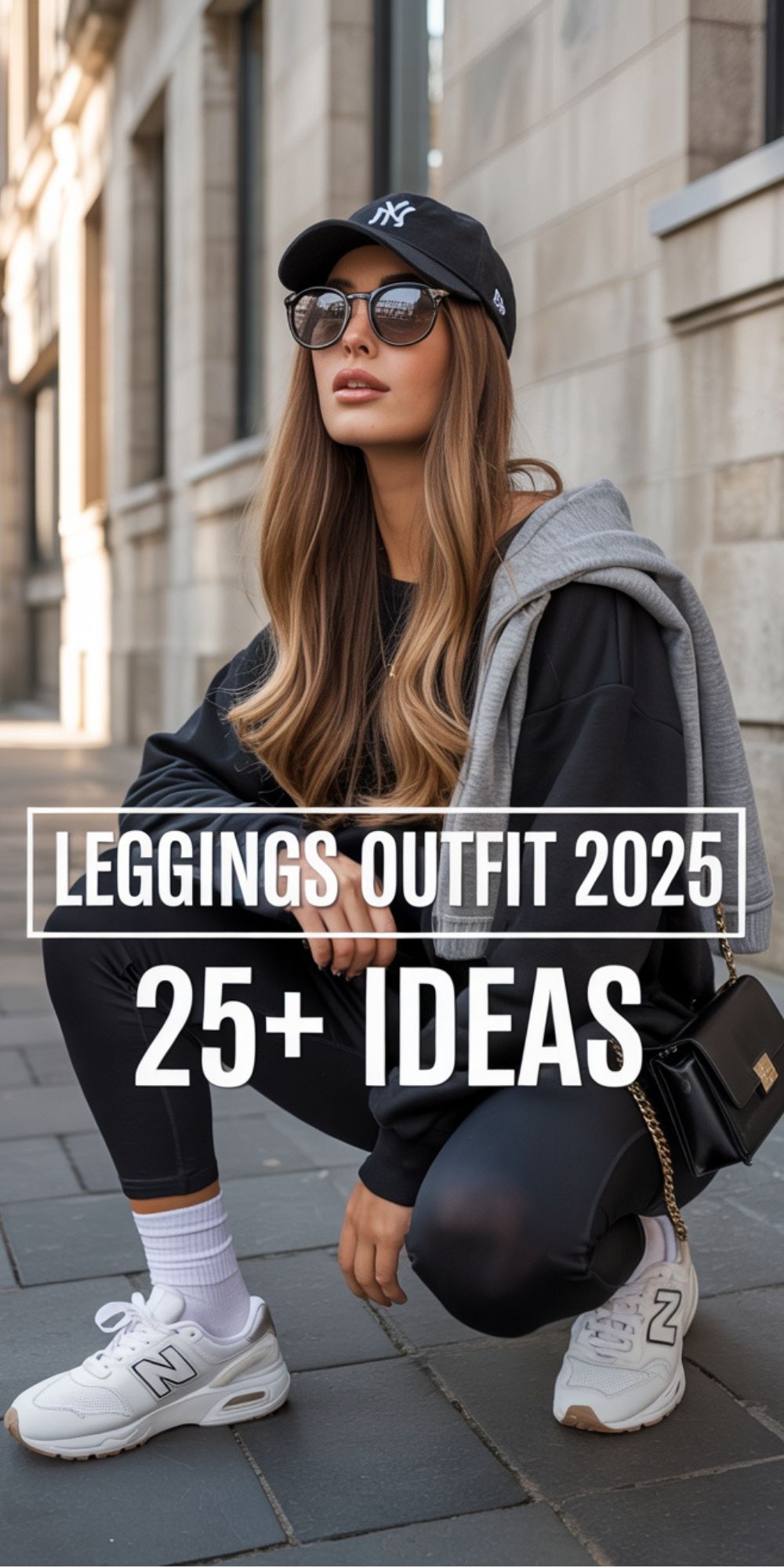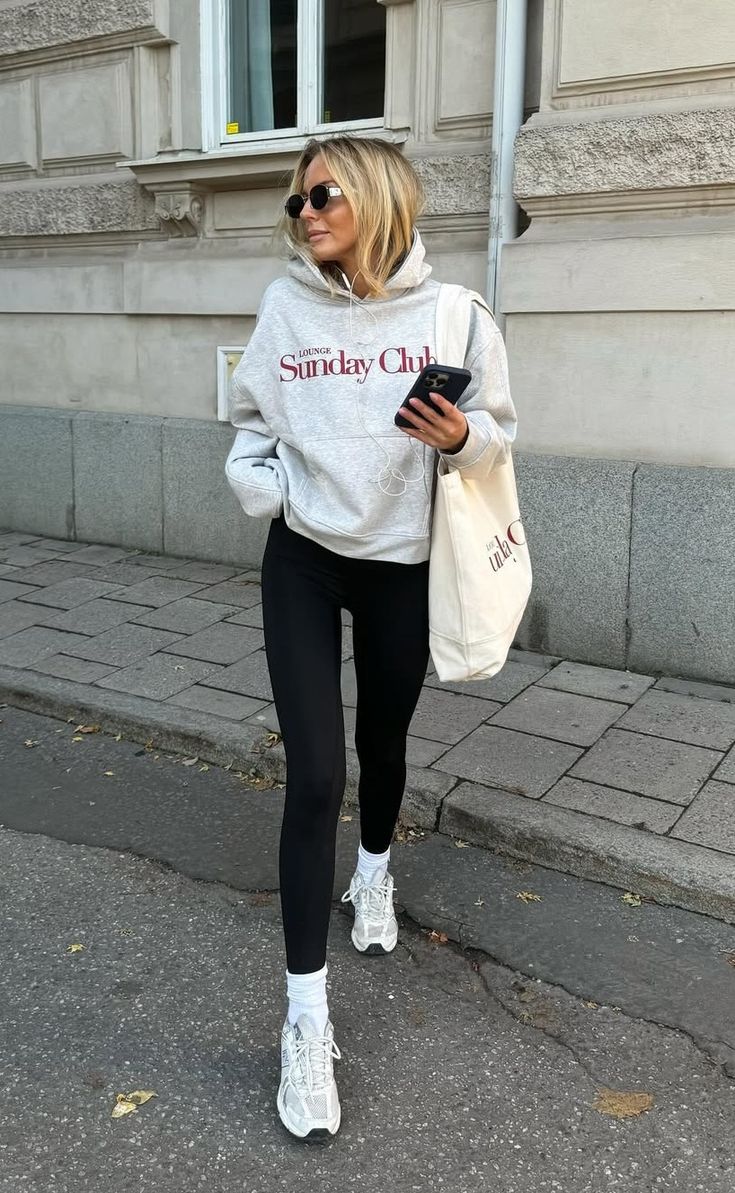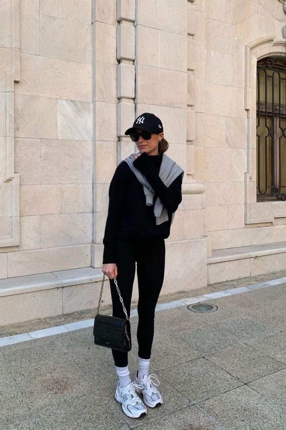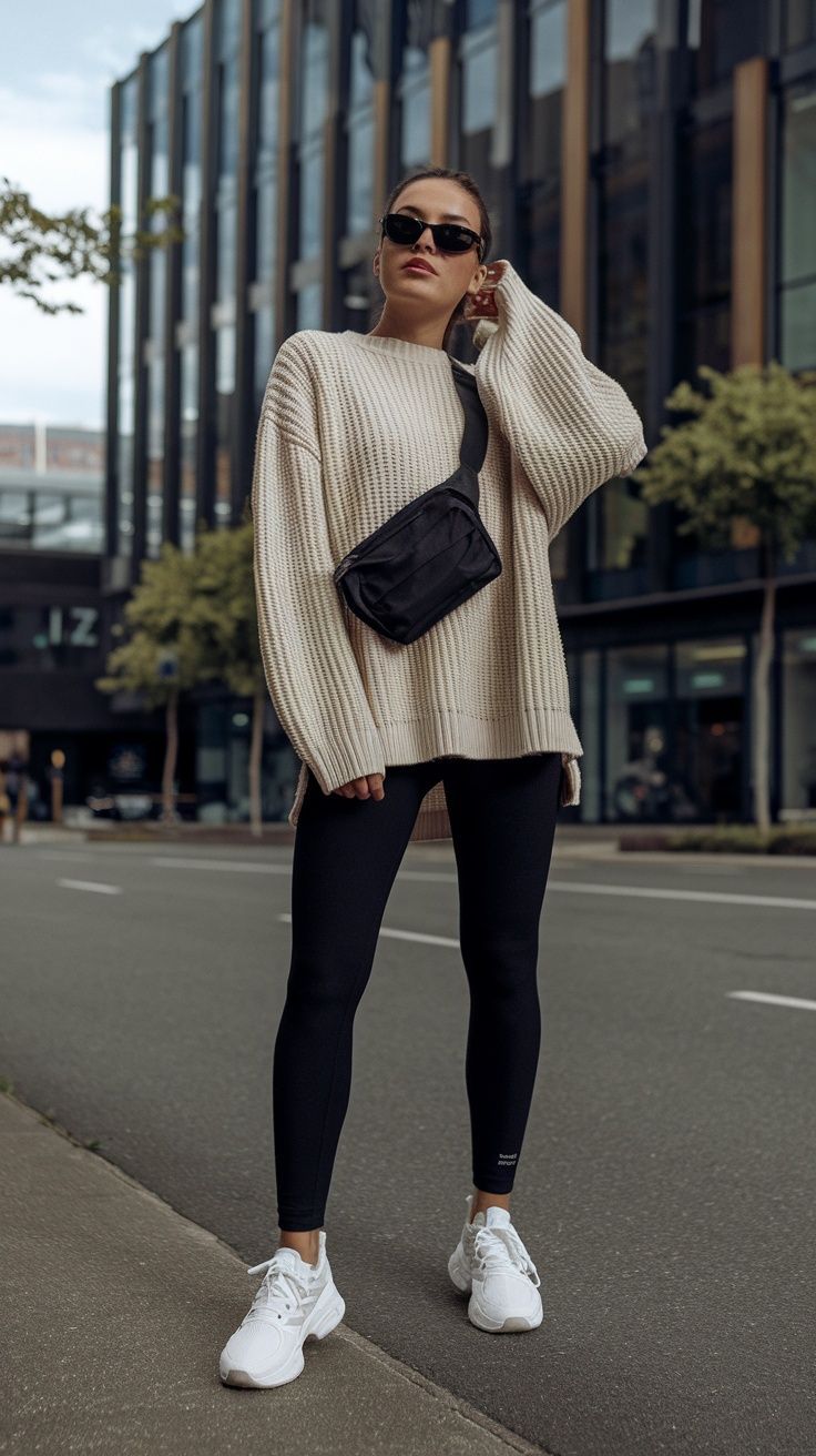A sleek black base of leggings and sweatshirt paired with chunky white sneakers keeps this outfit grounded in sport energy, while the baseball cap adds a nonchalant touch. Draping a grey sweater and across the shoulders gives it an updated, slightly European twist—like you’re on your way to grab a flat white in Milan. This style is flattering for taller or mid-height frames; for very petite figures, the oversized elements might swallow the proportions. Perfect for errands, weekend strolls, or travel days, but not exactly the right call for a dressy dinner.