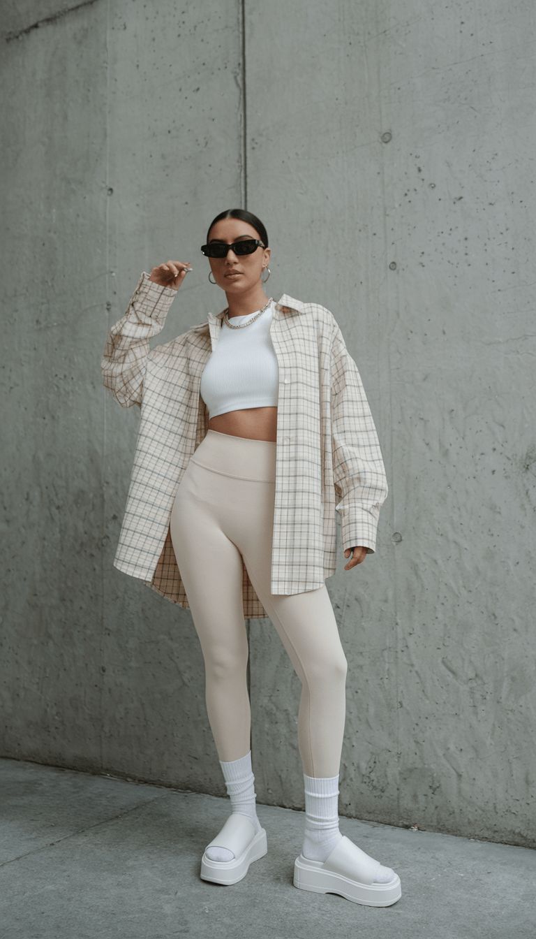 A crisp white crop top layered under an oversized checkered shirt instantly elevates cream leggings into something minimal yet stylish. The muted tones keep it fresh, while the exaggerated shirt length makes the outfit flattering for most figures, especially those who prefer extra coverage at the hips. It’s a style that works beautifully for casual coffee runs or low-key brunches, but maybe less so in formal business settings where tailoring is key.