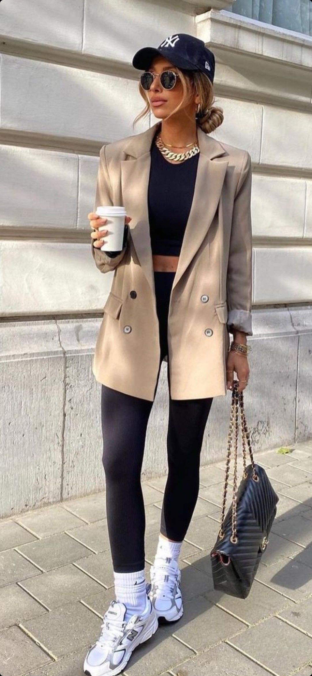 Leggings don’t get more elevated than when paired with a blazer and sneakers. A sand-toned double-breasted blazer layered over a black crop top and leggings creates the ultimate mix of business-meets-sport. It’s casual enough for errands yet sharp enough for casual workspaces. This silhouette flatters most figures because the blazer defines structure at the shoulders while the leggings elongate.
