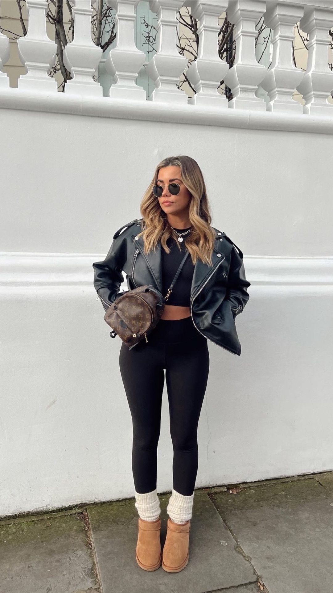 Here we get a softer twist on black leather styling. A cropped moto jacket toughens up black leggings, while cozy Uggs bring in a cute, playful vibe. It’s casual yet strong, a balance of toughness and comfort. Ideal for weekends, quick meetups, or low-key dates.