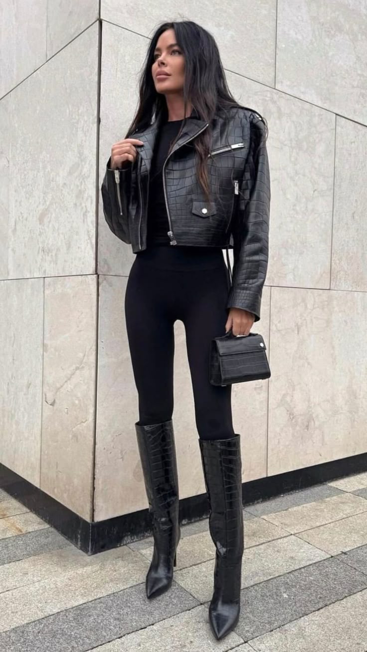 This outfit is unapologetically bold—cropped black leather jacket, leggings, and pointed knee-high boots and. It’s power dressing at its fiercest. Best suited for nights out or city events, less practical for casual errands. Works especially well on taller figures since the sharp boot silhouette elongates.