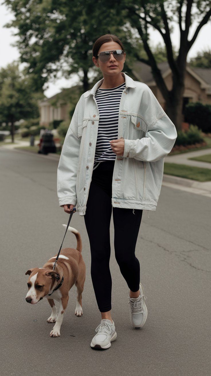 A striped tee tucked under an oversized denim jacket paired with black leggings creates the ultimate casual black look. This style is easy, laid-back, and wearable for any body type, especially for quick strolls or dog walks. It’s versatile enough to be worn in spring, fall, or even layered in winter.