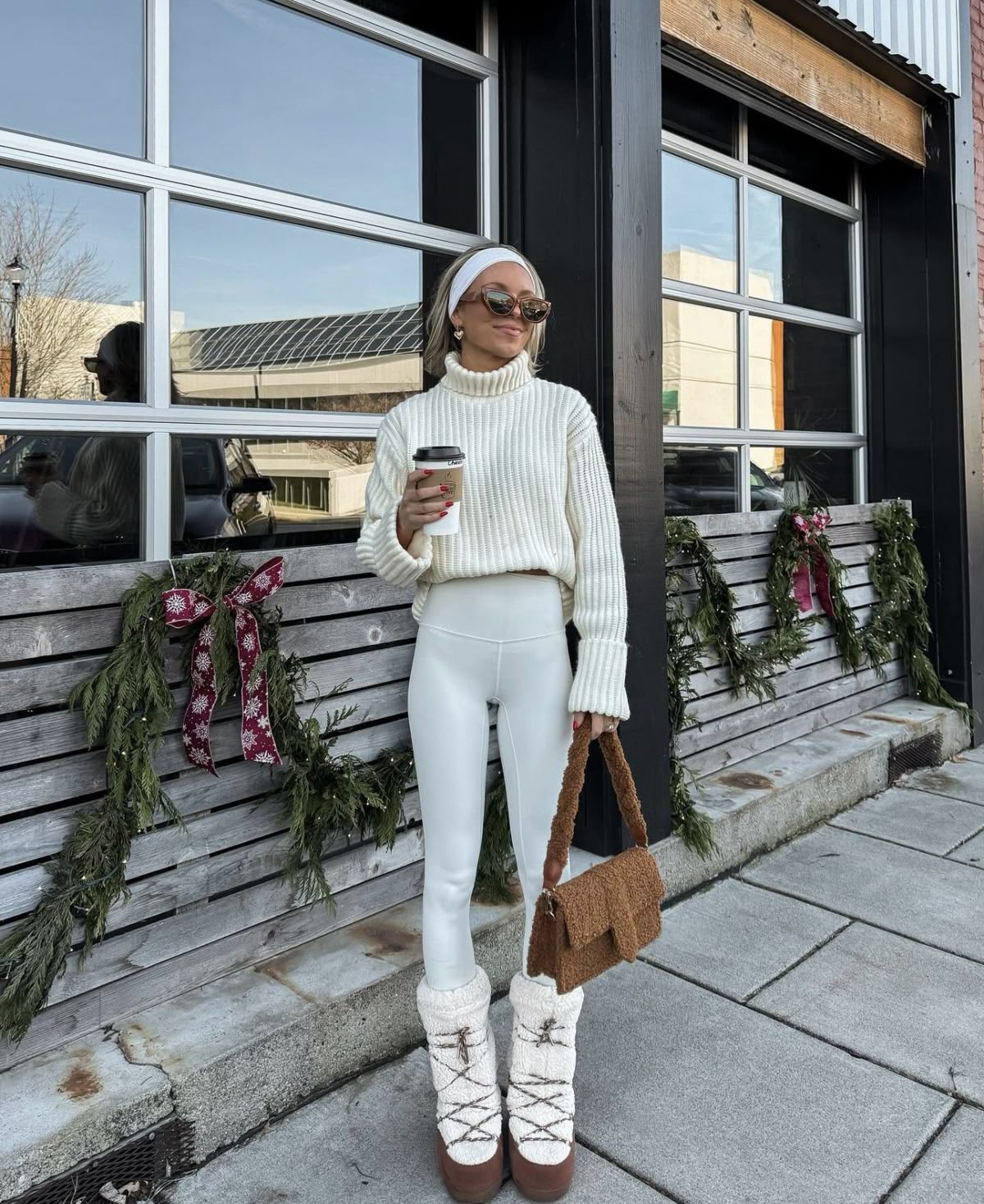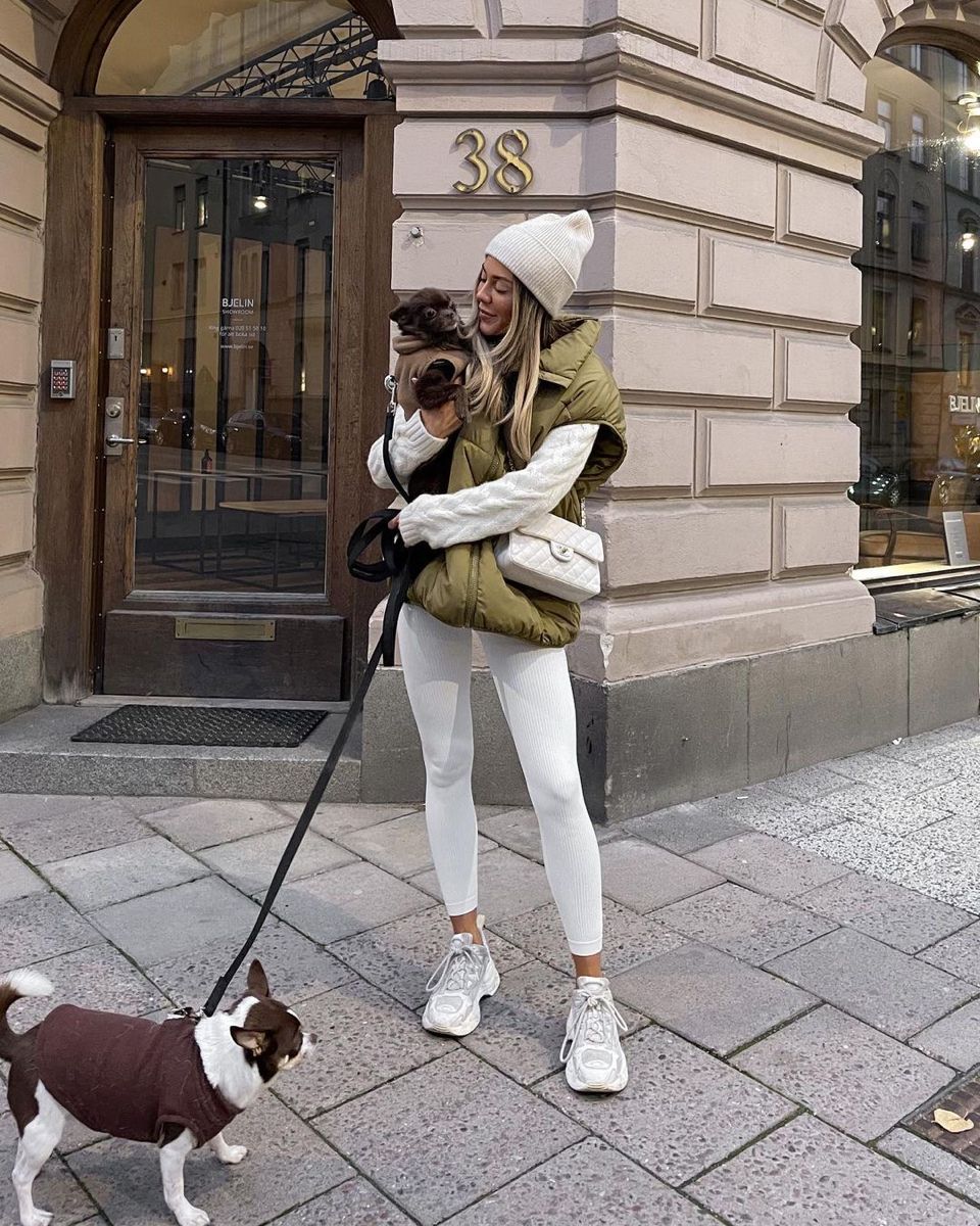 An all-white leggings outfit paired with a chunky sweater and snow boots is as cute as it gets for winter. It’s warm, chic, and feels like après-ski in the city. The monochrome palette is flattering on medium to darker skin tones, while fairer tones might prefer mixing with beige for contrast.