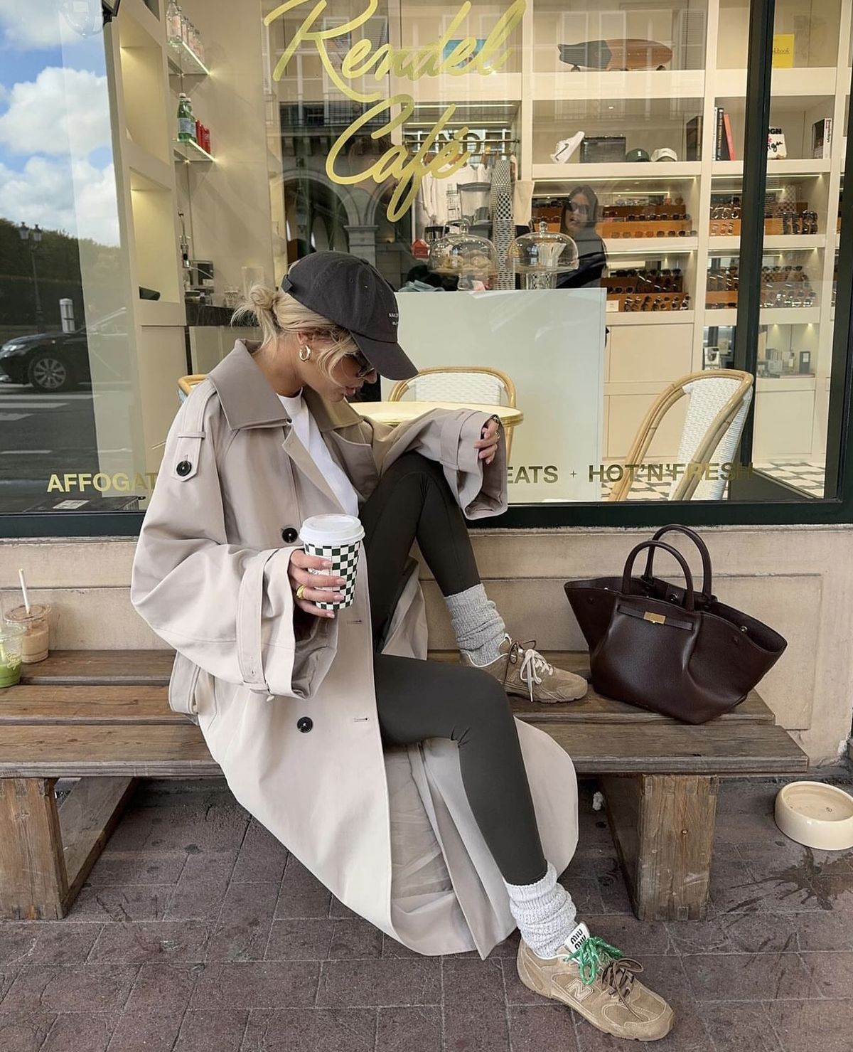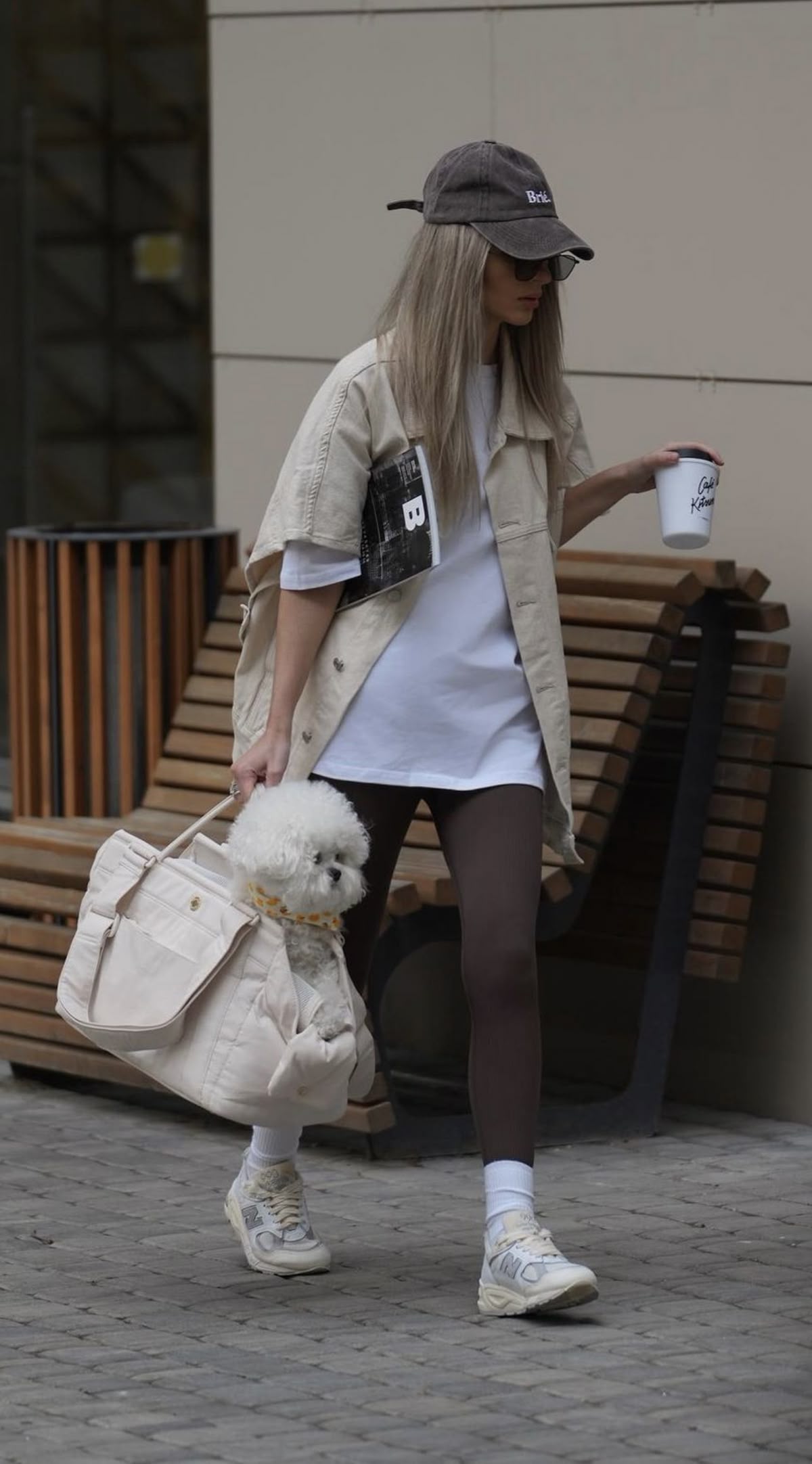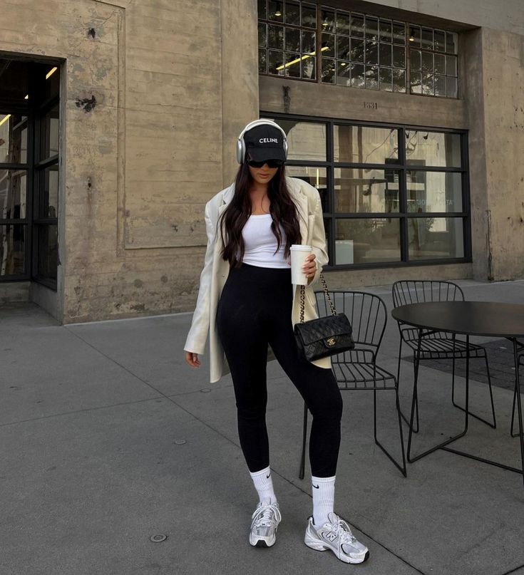 This style is the definition of updated streetwear—leggings paired with a white crop top, long cream trench, and sport sneakers. It’s crisp, chic, and balanced with practical accessories like headphones and a structured bag. Perfect for city days when you want effortless polish with movement.