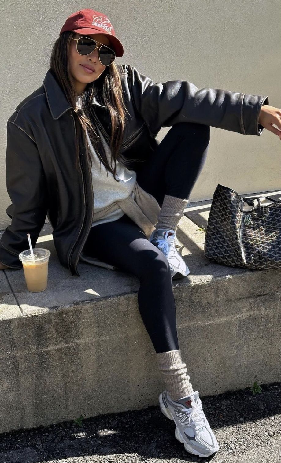 This look screams relaxed casual black with a whisper of cool-girl toughness. The oversized black leather jacket contrasts with slim leggings, while the baseball cap and aviators give pure off-duty sport star. The mix works beautifully for transitional weather, though the bulk of the jacket could overwhelm petite frames. Think iced latte in hand and nowhere rushed to be—it’s the perfect fit for coffee runs, casual hangouts, or lazy Sundays when you still want to look pulled together.