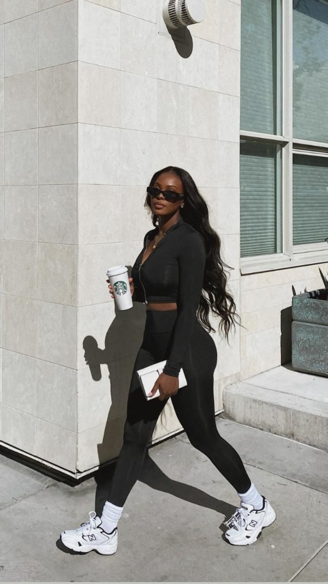 When in doubt, go black head-to-toe. This fitted cropped jacket with matching leggings is sleek, body-conscious, and absolutely versatile. The addition of white sneakers and a Starbucks cup gives the look that quintessential 2025 “fashion girl on the move” energy. Works beautifully for toned figures or those who like a streamlined silhouette. Ideal for casual outings, shopping days, or even working from a stylish café. Less great for overly formal settings.