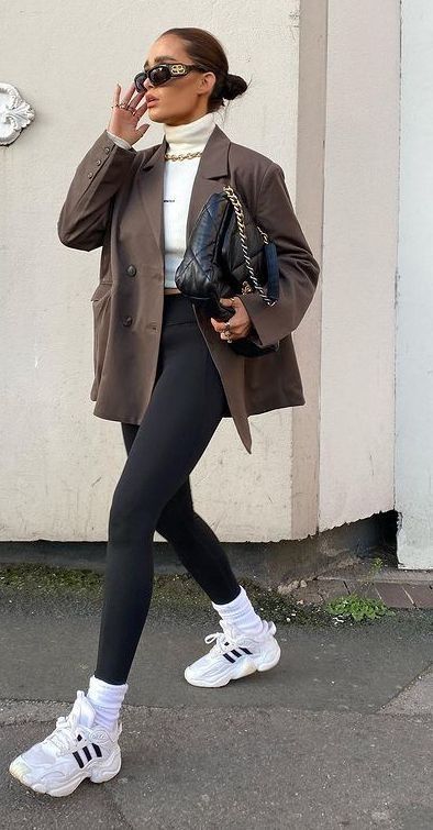 Leggings with a structured blazer and always give that “business meets comfort” energy. This pairing of black leggings, white turtleneck, and oversized blazer shows how casual black can instantly feel editorial with the right tailoring. The sneakers keep it grounded, while gold jewelry and a quilted clutch elevate. Great for city strolls, creative office days, or networking coffee dates. Less appropriate for formal boardrooms.