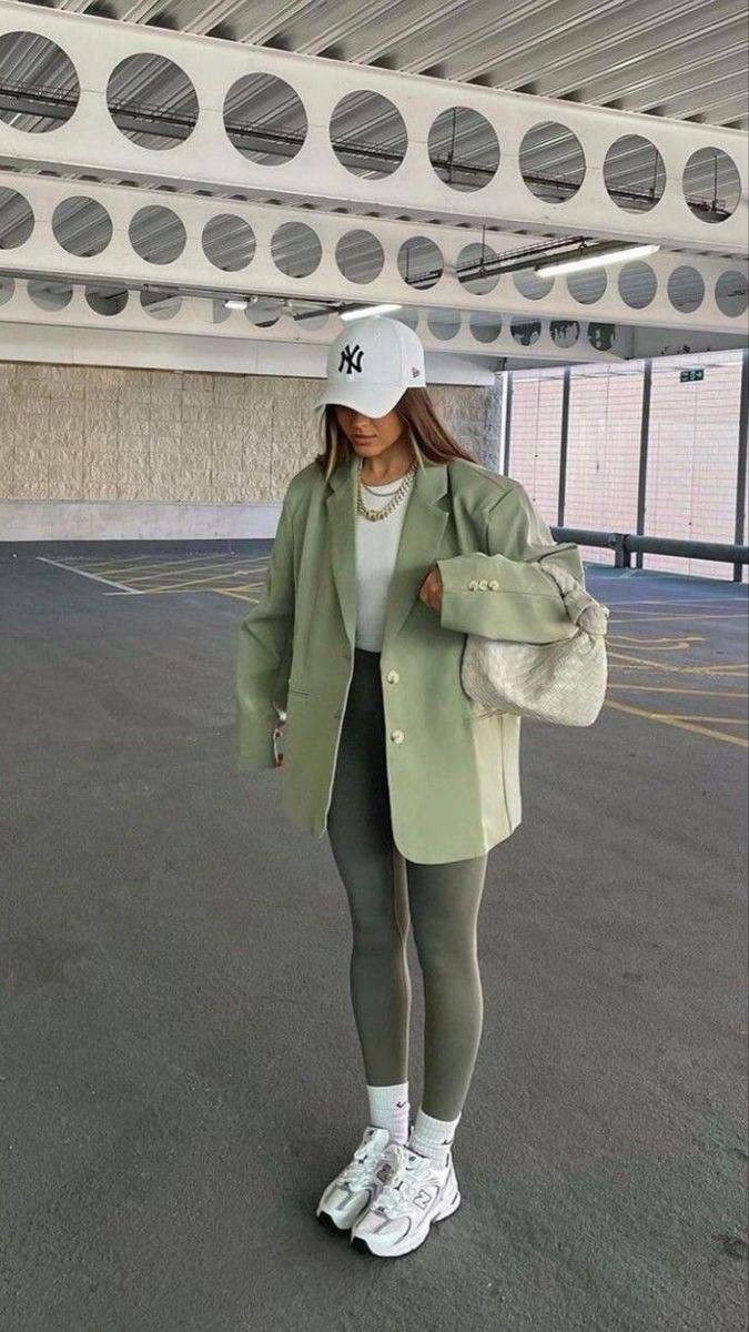 Finally, a dose of soft green tailoring. An oversized mint blazer and grey leggings create a modern contrast, with chunky white sneakers tying it all together. This look works well for taller frames or those comfortable with oversized silhouettes. Best for city afternoons, lunch dates, or street-style moments. Probably too bold for corporate meetings, but perfect for creative work.