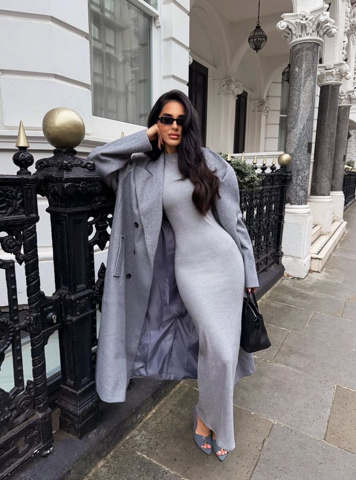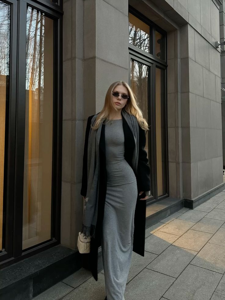 A long grey dress paired with a matching oversized coat taps into that perfectly urban blend of understated design, soft luxury, and practical warmth. The ribbed, fitted bodycon silhouette follows the curves elegantly without ever feeling too tight, making it ideal for hourglass and rectangular shapes. It creates a long vertical line, which visually lengthens the frame, while the grey palette keeps the look refined enough for winter, travel days, or even a polished casual brunch. It’s not the best option for extremely hot climates, but as a transitional piece or cool-weather staple, it’s effortlessly elegant.