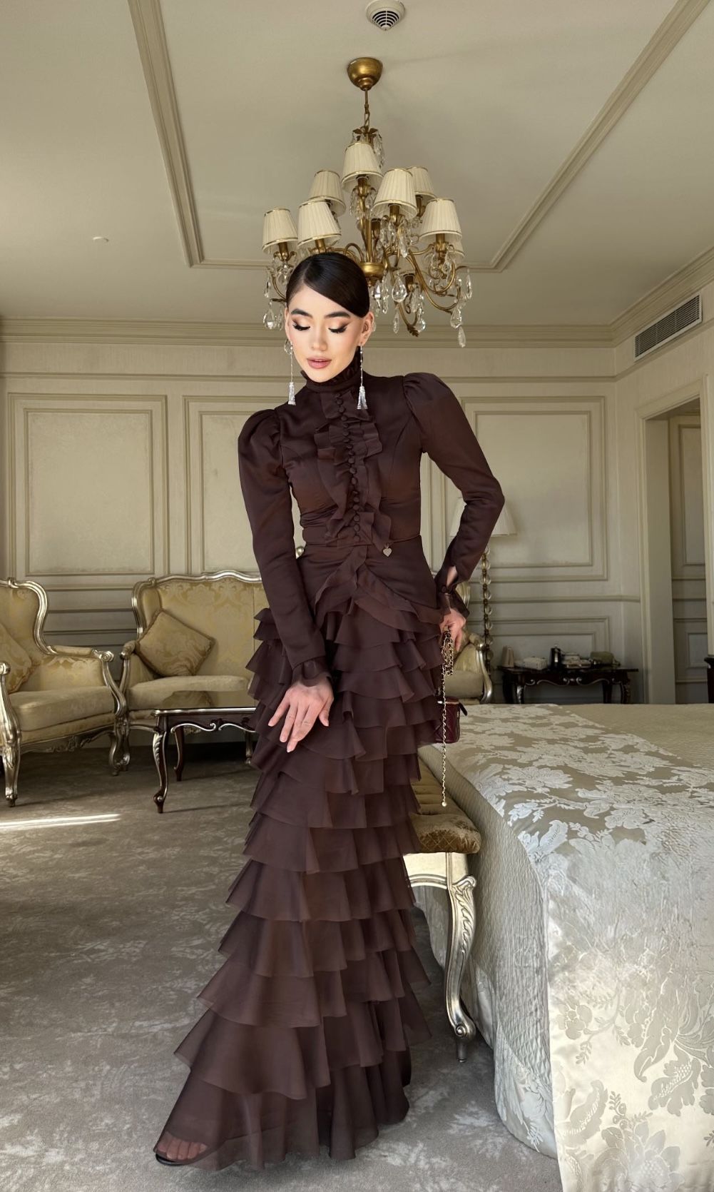 The rich brown tiered ruffle gown brings a sophisticated yet dramatic profile, perfect for someone who wants volume without losing structure. The high neckline, long sleeves, and cascading chiffon layers create a regal vertical movement, ideal for tall and medium-height body frames. This Formal look thrives in elegant dinners, cultural events, or winter indoor soirées where texture and depth feel seasonally aligned. Not suited for humid summer climates due to its layered construction.