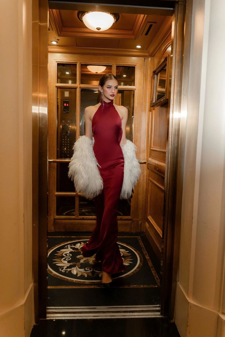 The deep red satin gown with a minimalistic halter silhouette balances sensuality and sophistication. Its smooth lines make it a strong choice for straight, athletic, and hourglass figures, delivering a polished Evening outfit for romantic dinners, cocktail nights, or festive events. The oversized feather stole introduces movement and softness while sharpening the dress’s sleek contrast, making the look ideal for colder seasons. Not ideal for professional settings as the neckline leans more glamorous.