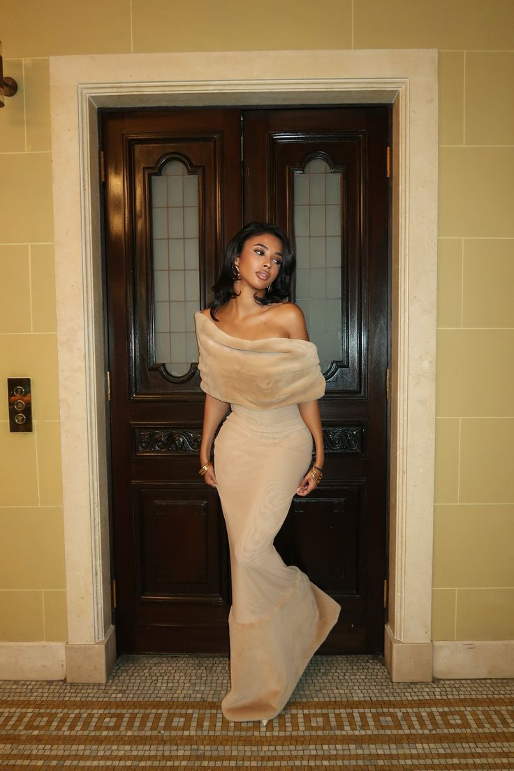 The creamy beige off-shoulder gown brings a sculptural softness that feels distinctly modern yet timeless. The body-hugging fit works beautifully for hourglass and pear shapes, as the draped neckline balances the hips and adds an Elegant softness. This dress is ideal for engagement parties, upscale dinners, or aesthetic indoor celebrations. It’s not suited for outdoor summer events—the fabric reads warm and plush, better aligned with transitional or Winter seasons.