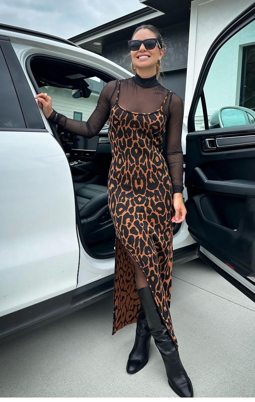 This black and brown leopard print dress layered over a mesh turtleneck is the perfect blend of casual edge and bold confidence—ideal for mild winter days or early spring. It’s a great outfit for rectangular and apple body shapes, as the pattern and high neckline create balance while the slit adds movement. The knee-high boots ground the look, making it appropriate for brunches, city outings, or modern day-to-night dressing. Not suited for formal spaces due to its playful print.