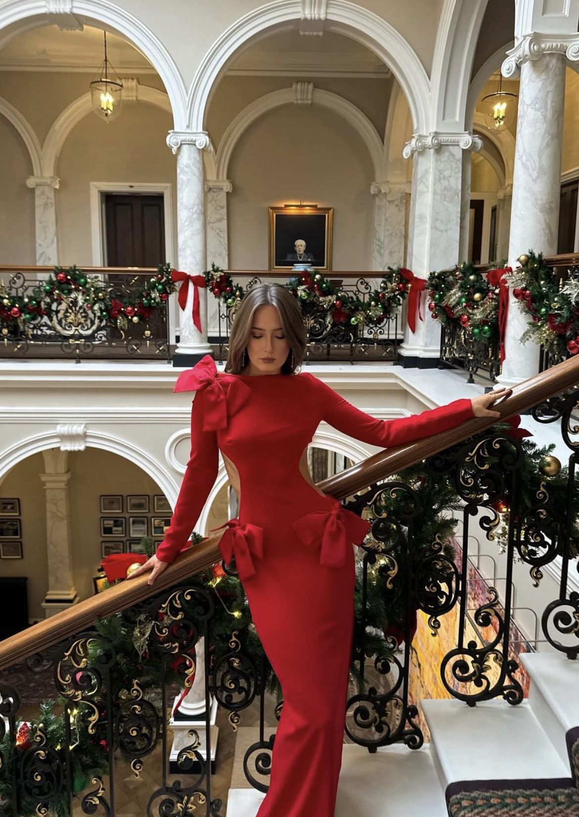 The vibrant red gown with sculptural bows and side cutouts blends drama with refined tailoring, ideal for confident wearers. Its fitted structure suits hourglass and athletic figures particularly well, offering a bold Elegant party option for holiday events, upscale galas, or luxury hotel celebrations. Not suited for minimalist dressers—the statement bows are intentionally theatrical.