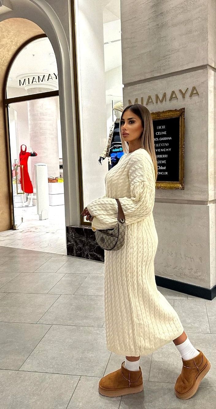 This cream cable-knit maxi is the definition of a winter comfort classic — that perfect blend of warmth, texture, and all-day practicality. The dress works beautifully for most body shapes except extremely petite frames, who may feel swallowed by the volume unless the knit is slightly slimmer. What makes this look shine is how the creamy white tone plays with the cable texture, creating a luxurious softness that naturally reads cute, warm, and elevated casual. Paired with chestnut boots and a structured logo shoulder bag, the styling hits that sweet spot between relaxed and polished — ideal for shopping days, cozy brunches, and casual photoshoot ideas.