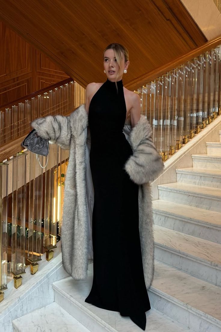 This black halter gown defines pure evening glamour—sleek, statuesque, and deeply refined. The long column silhouette hugs the torso while the faux-fur coat adds that “old-Hollywood stepping-out-of-the-limo” vibe. It’s perfect for formal dinners, elegant party settings, or winter galas. Though stunning on most body types, the high neckline especially suits those with defined shoulders or longer necks. It’s less suited for extremely casual settings, but as a formal showstopper, it’s unmatched.