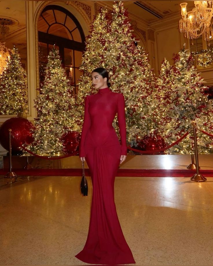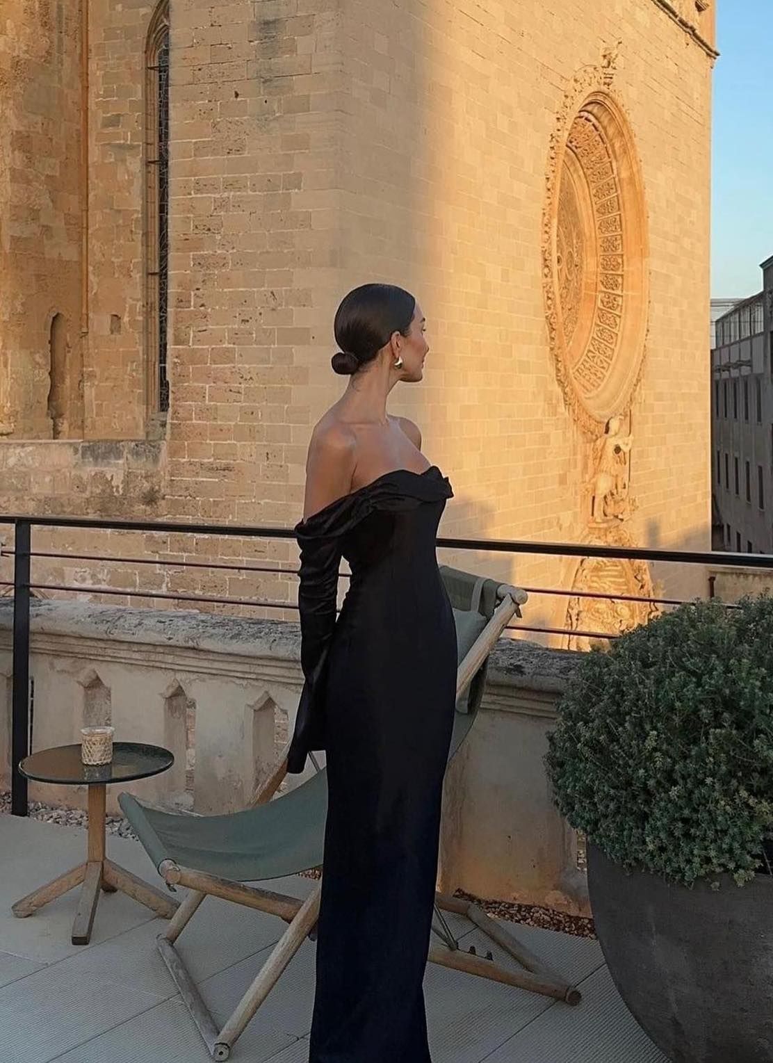 There’s always a moment each year when a black gown stops you in your tracks — and this one does exactly that. The off-shoulder neckline and long sculpted sleeves create a statue-like silhouette that feels both elegant and quietly dramatic. This type of dress shines brightest on hourglass, straight, and athletic frames thanks to its clean bodice and elongated fall. It’s ideal for evening, luxury terraces, cocktail events, or intimate formal dinners — anywhere the dress can catch soft sunset light and show off its depth.