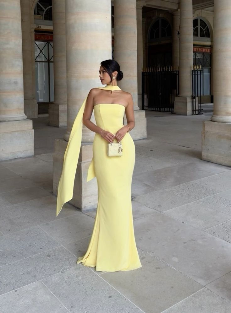 Now this one — pure architectural beauty. A long yellow gown with a unique attached scarf detail wrapped around the neck, the kind of dress that feels sculptural yet soft. It’s ideal for summer, garden events, modern formal receptions, and even high-fashion editorial moments thanks to its graphic simplicity. Works wonderfully for taller frames and those who love structured silhouettes that still feel fluid.